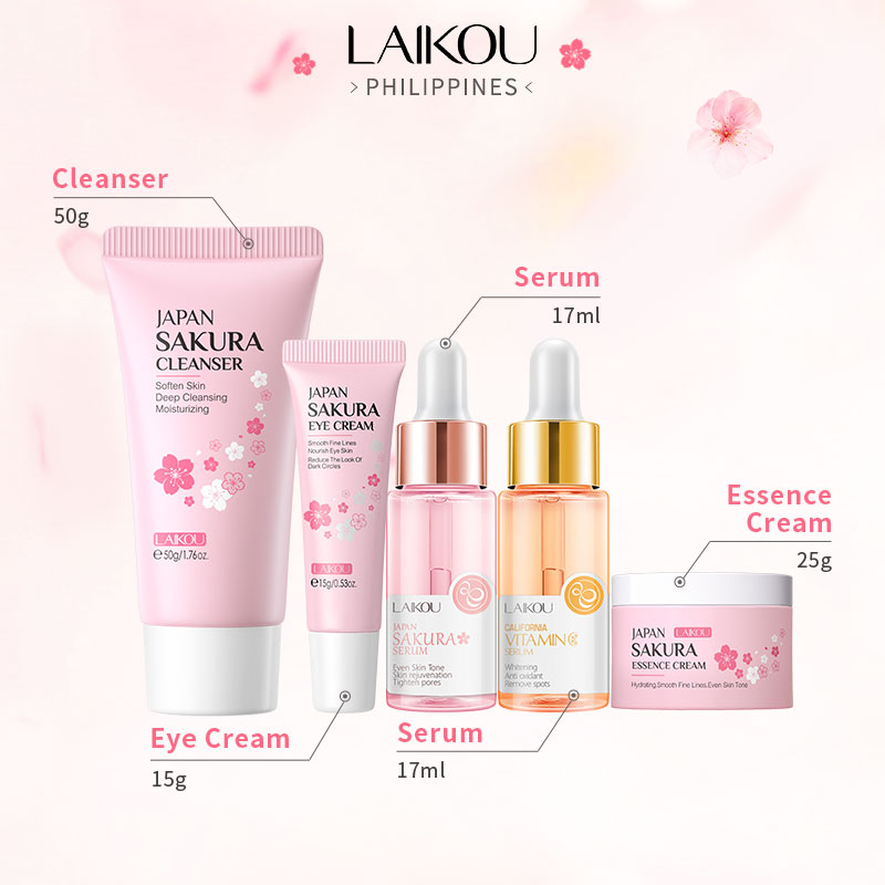 LAIKOU 5pcs Skincare Set Vitamin C Sakura Serum Cream Cleanser Brightening Soothing Fade Spots Set