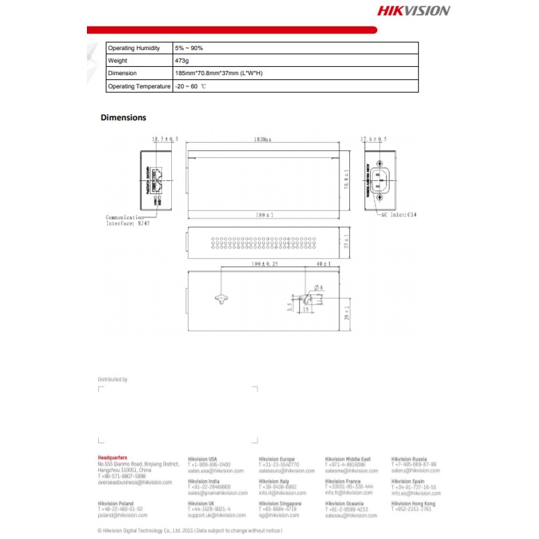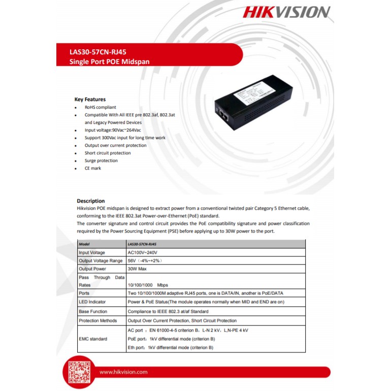 LAS30-57CN-RJ45 - HIKVISION GbE PoE 30W Injector (30W PoE injector)