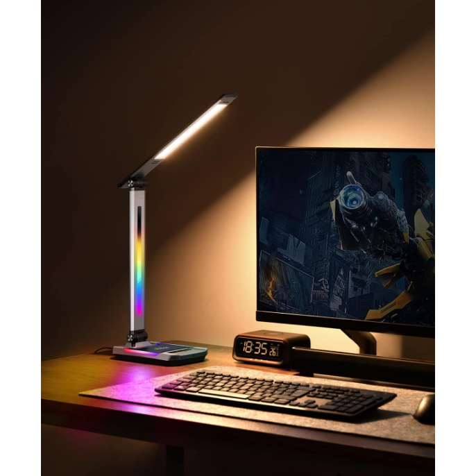 RGB Gaming Desk Lamp, Voice Activated Changing Colors Rhythm Light with Wireless Charger and USB