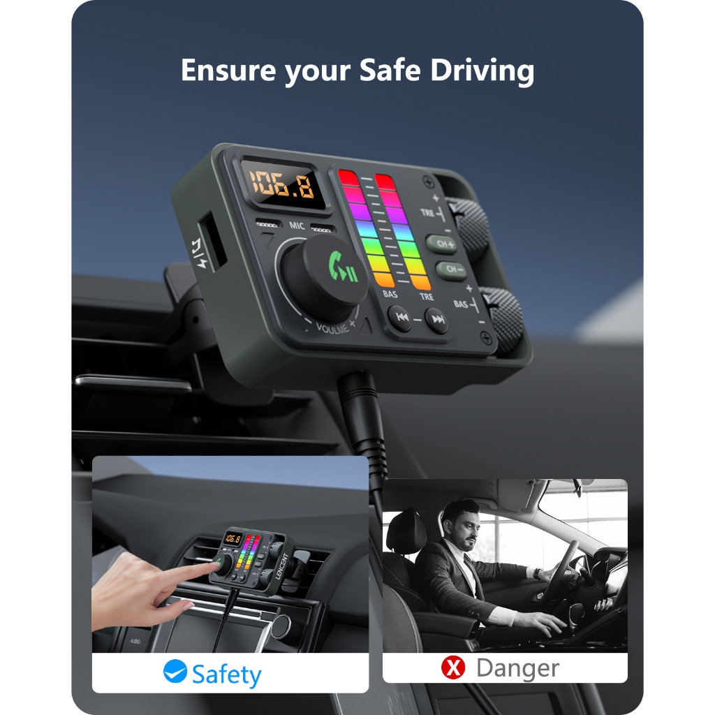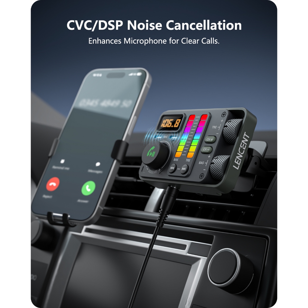LENCENT Bluetooth 5.3 Car FM Transmitter, Hi-Fi Treble & Bass Music Player, PD20W QC18W Fast Car Charger Radio Bluetooth Car Adapter with Dual Mics for Hands-Free Call, Siri&Google