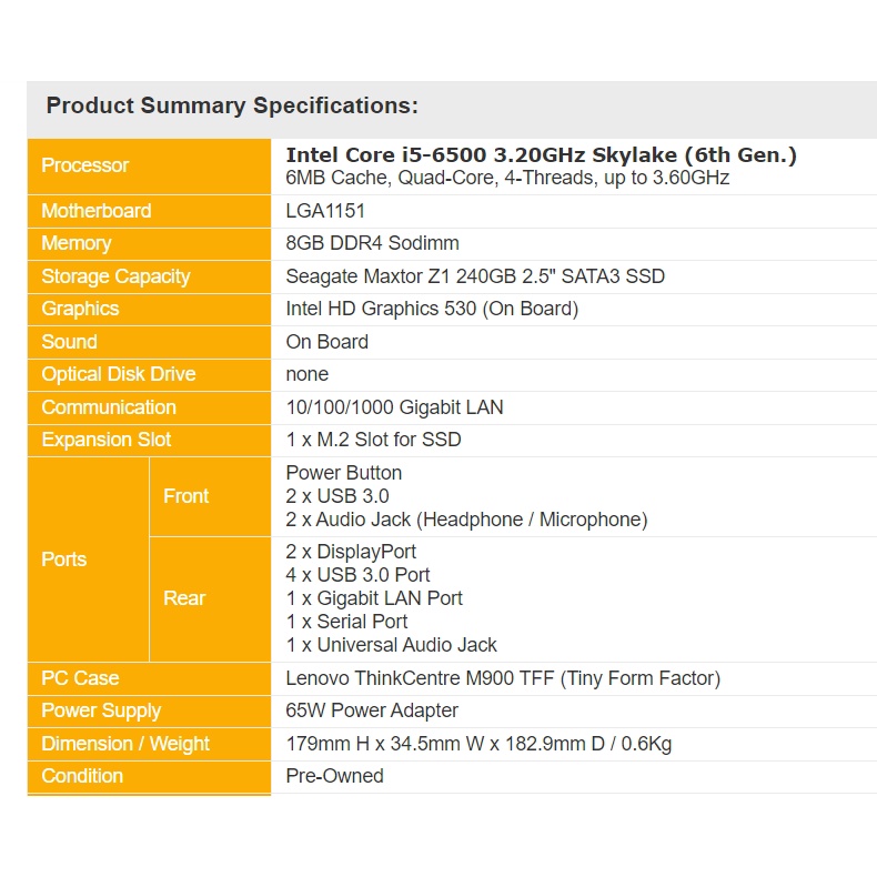 LENOVO ThinkCentre M900 TFF CORE I5-6500 8GB 240GB SSD LEGAL WIN10 Home 64Bit