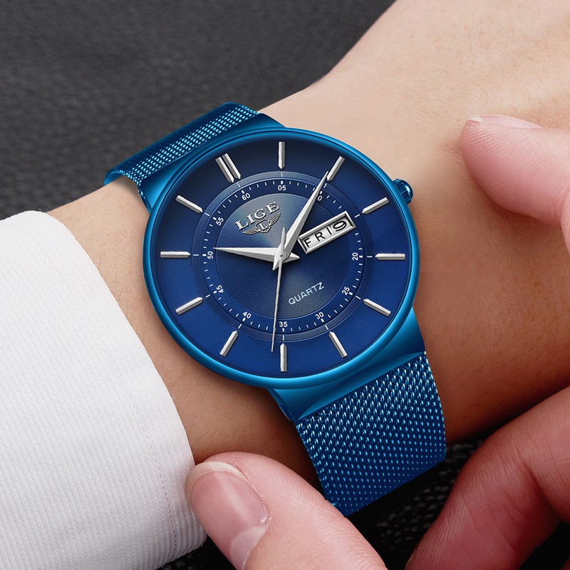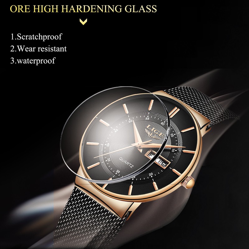 LIGE Original Brand Men's Watch Simple Mesh belt Waterproof Quartz Watch + Box