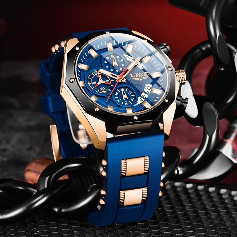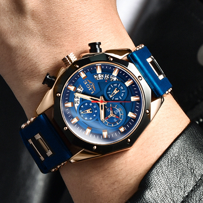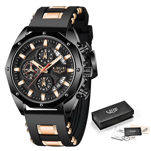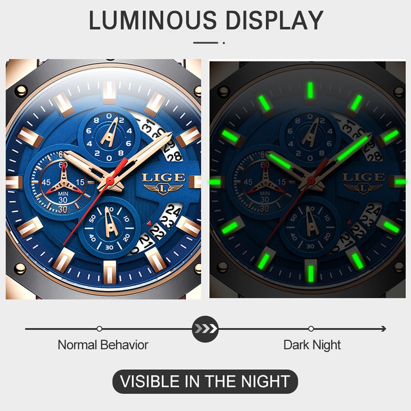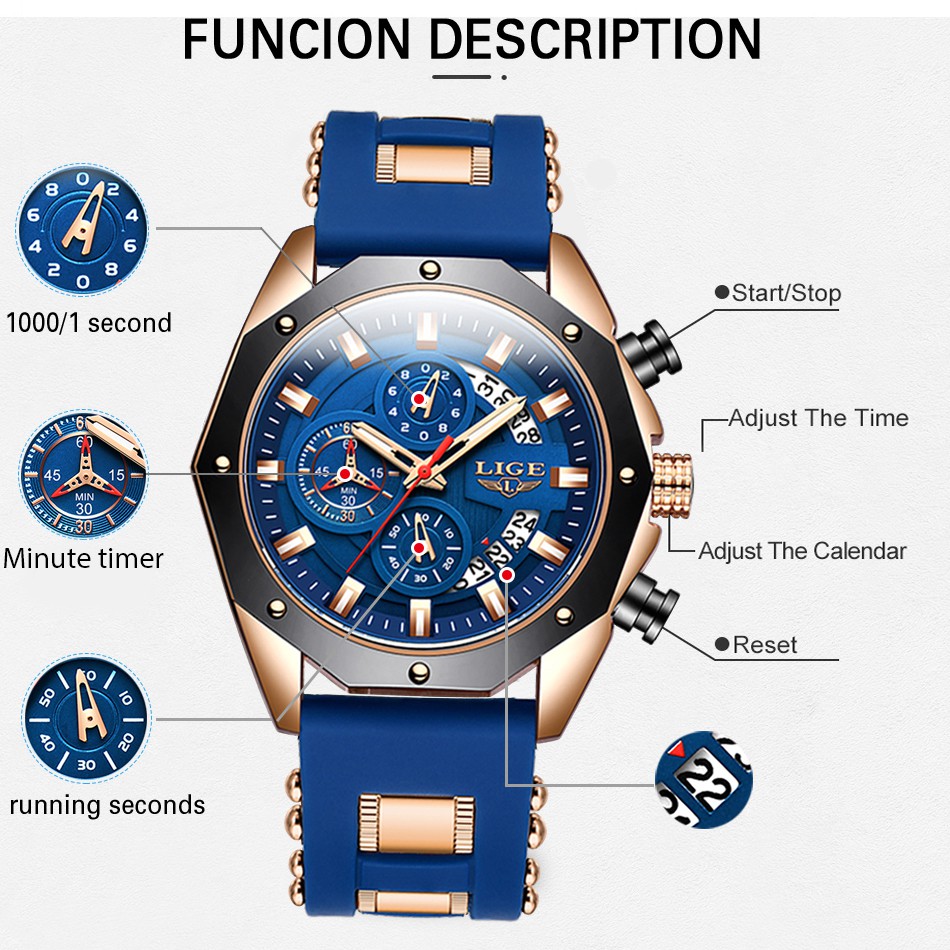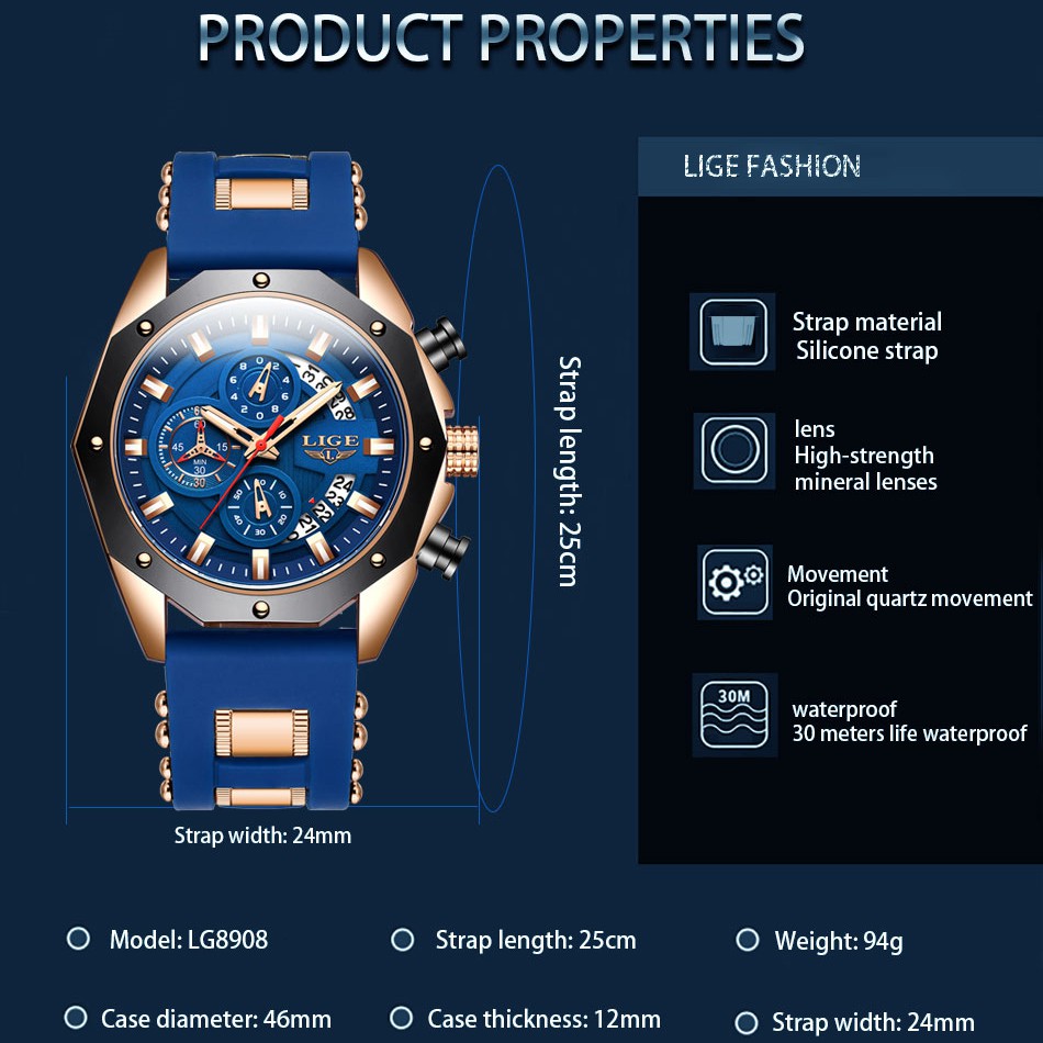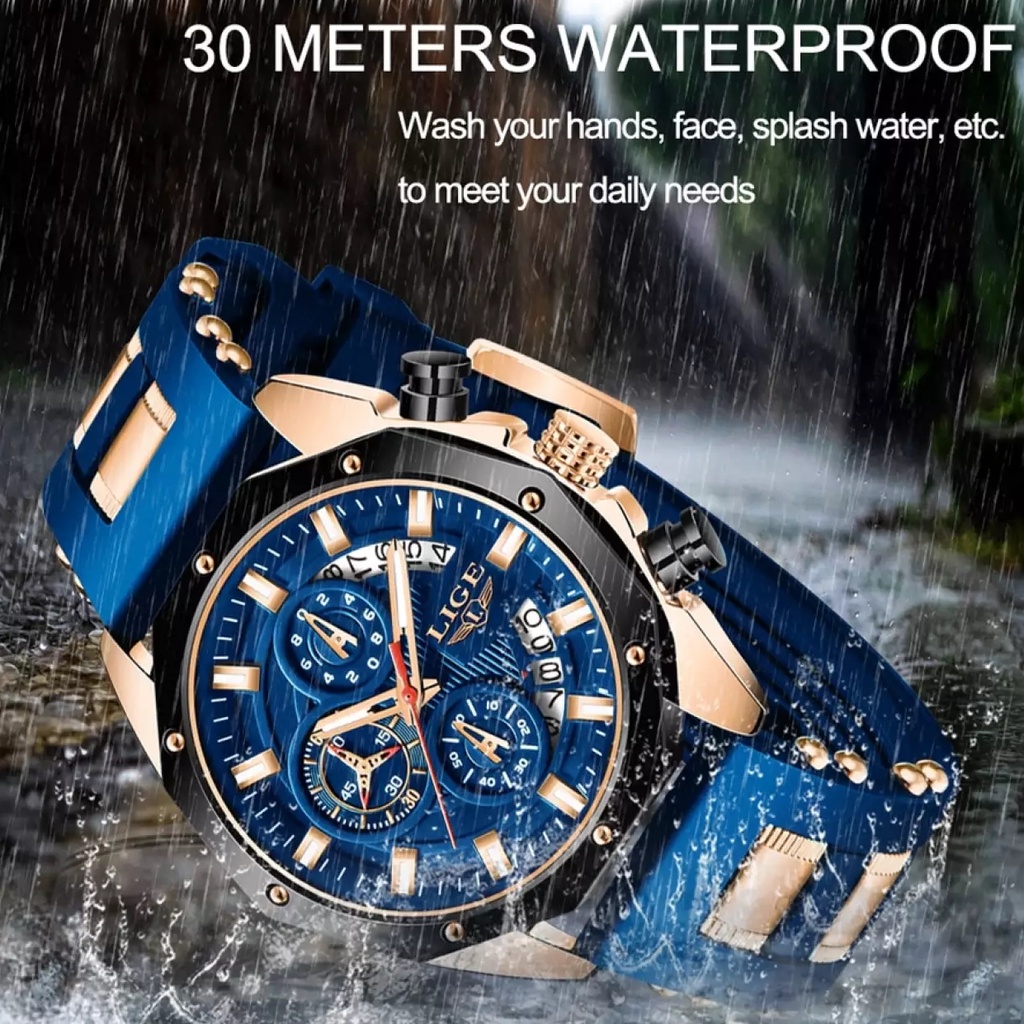 LIGE Original Watch Men Sports 30M Waterproof Wristwatch Luminous Pointer Full Calendar Chronograph Quartz Relo For Men + Free Box