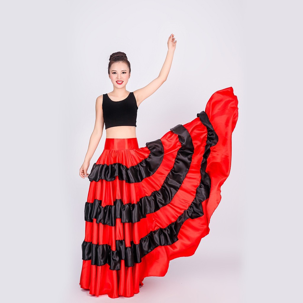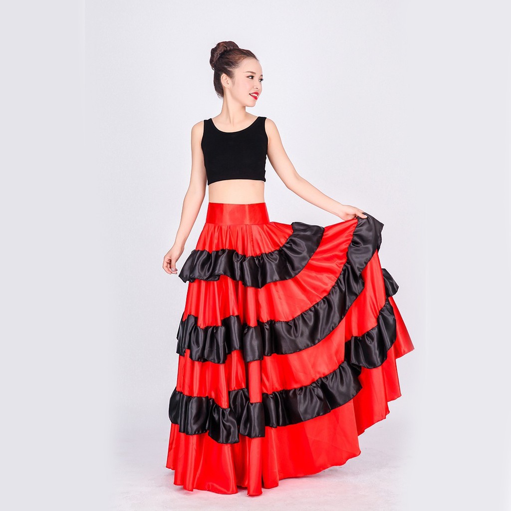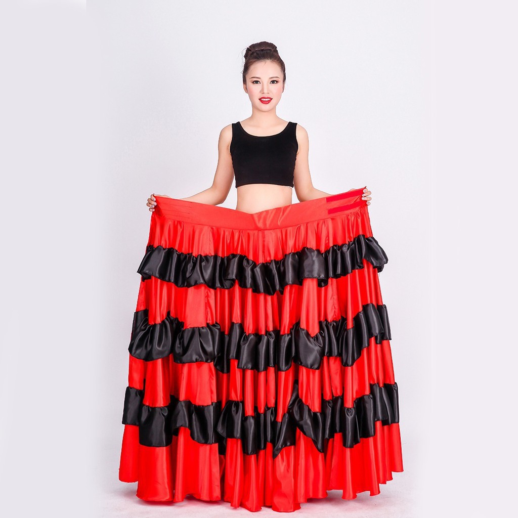 Lolanta Women Black Red Layers Satin Long Skirt For Spanish Flamenco Belly Dance Gypsy Mexico Ballet Folklorico Performance Costume Velcro