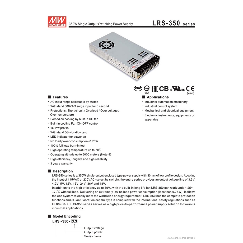 LRS-350-24 MEAN WELL 350W 24V Switching Power Supply 110V/220V AC To 24V DC 14.6A 350W Meanwell Dc Power Supply Transfor