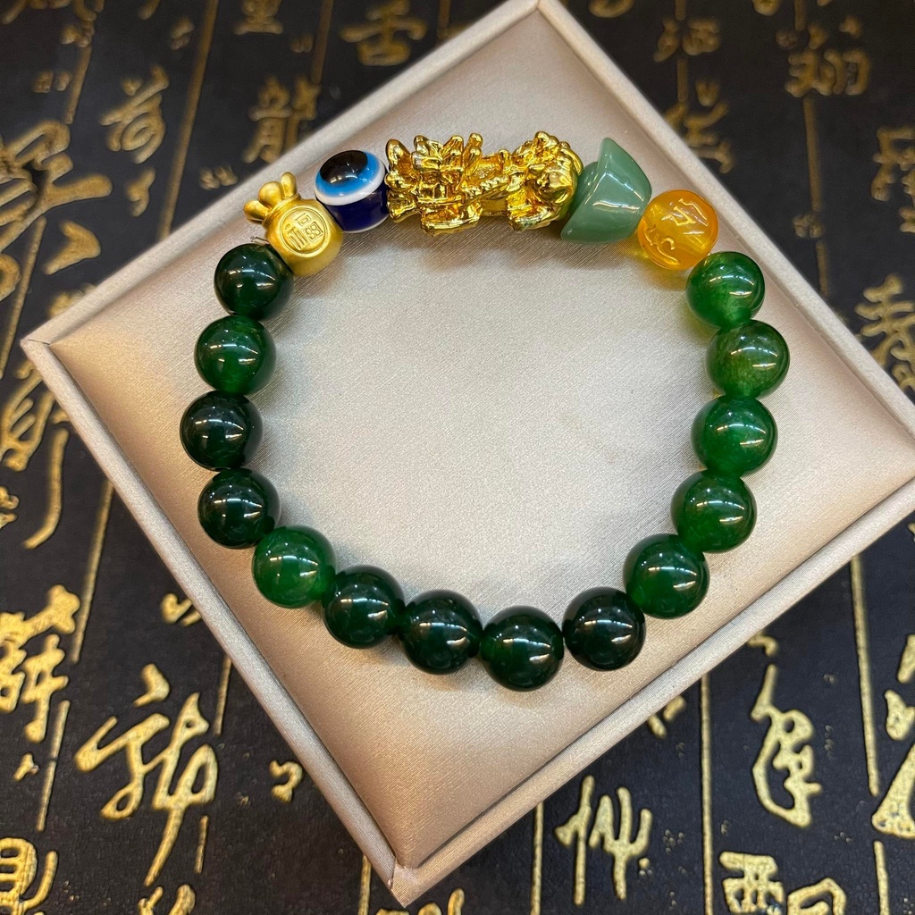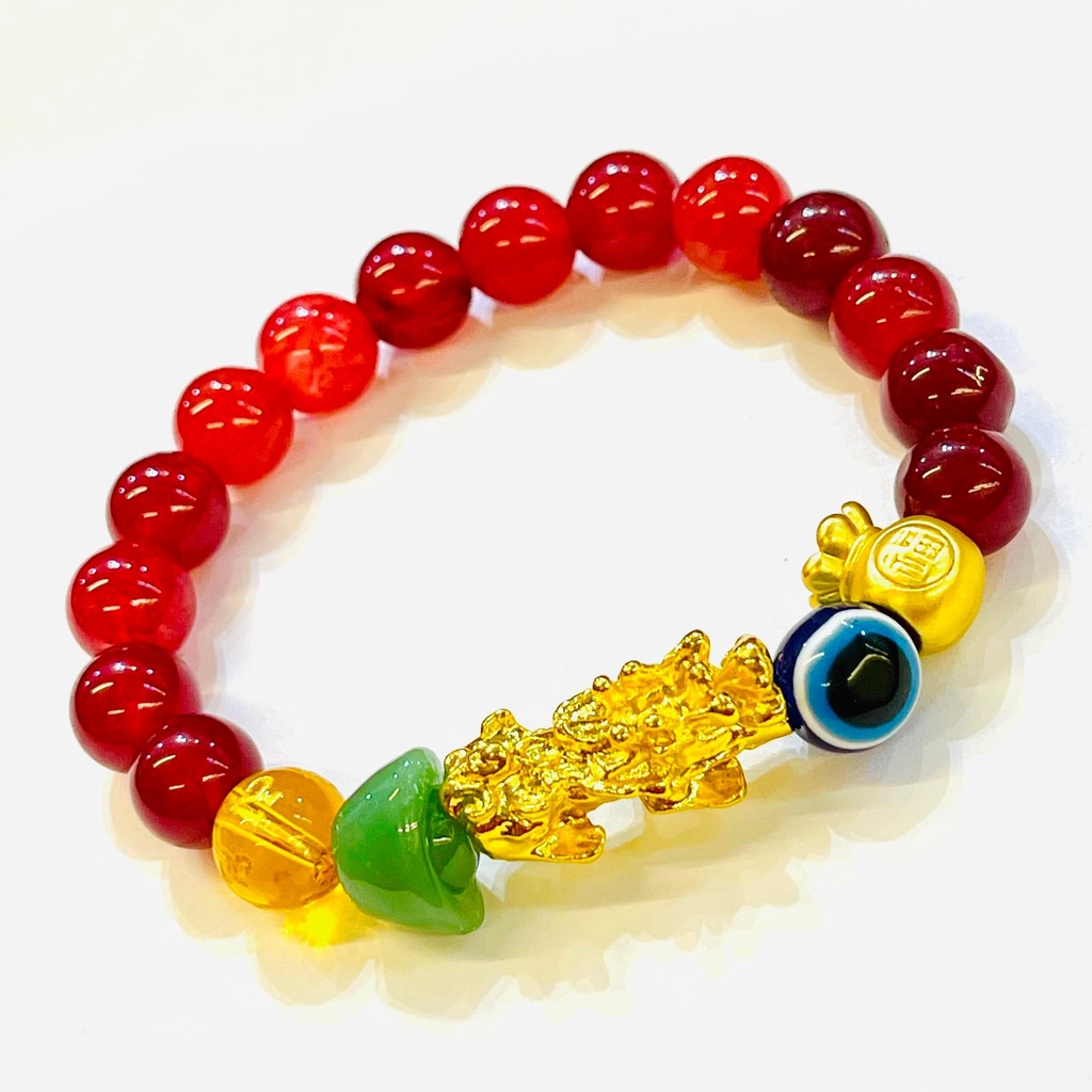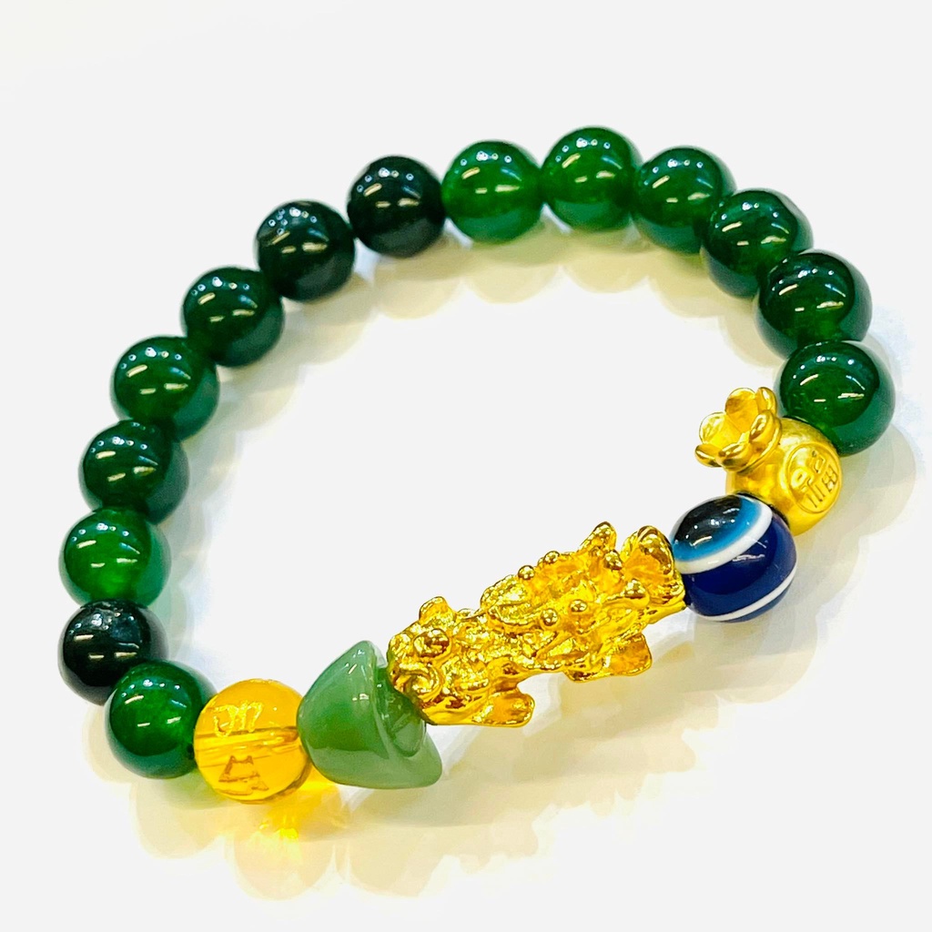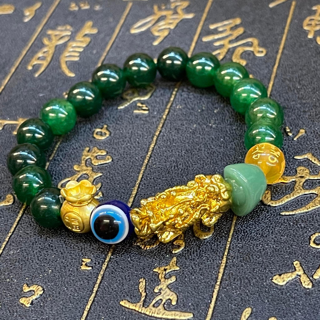 LUCKY CHARM PIYAO MONEY CATCHER W/ JADE, MANTRA ,EVIL EYE BRACELET
