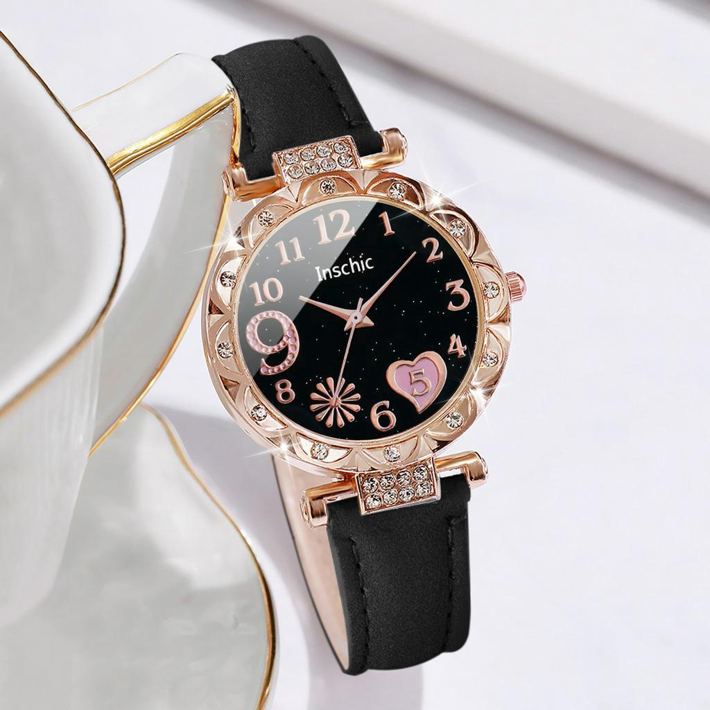 Stylish Women's Rhinestone Starry Heart Dial Quartz Watch + Heart Leaf Bracelet Combo