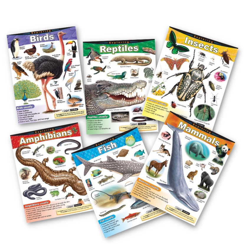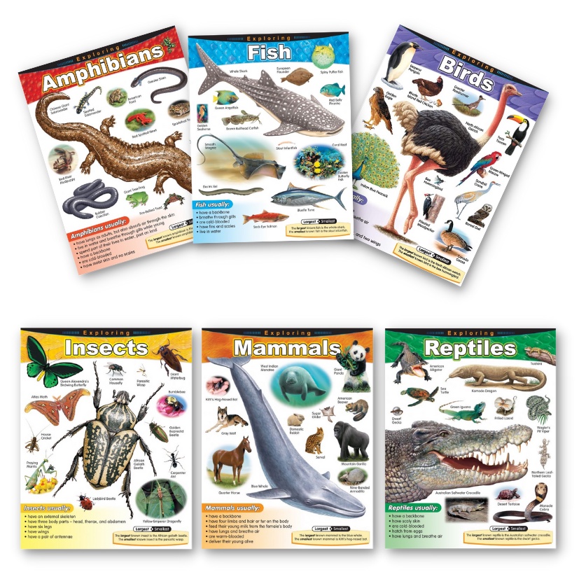 Laminated Animals Charts, Amphibians, Birds, Fish, Insects, Mammals, Reptiles Charts