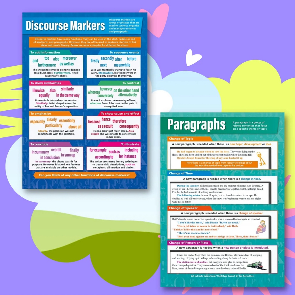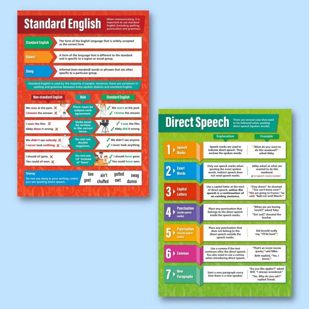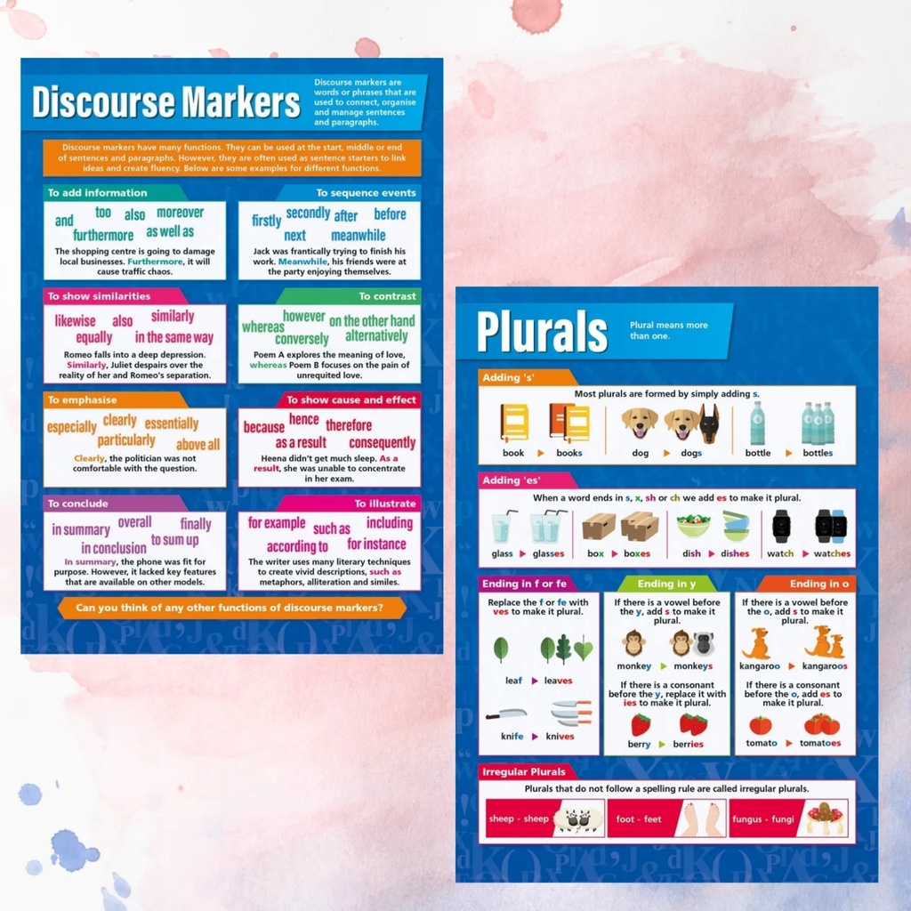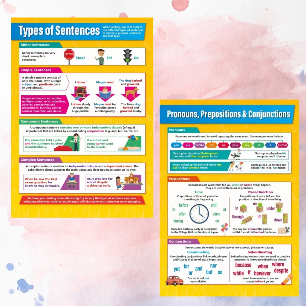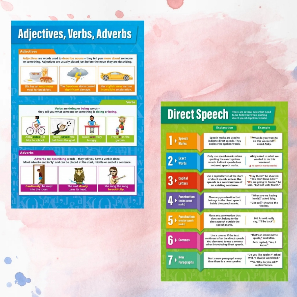 Laminated English Grammar Charts for Students and Teachers, Nouns, Verbs, Pronouns, Adjectives