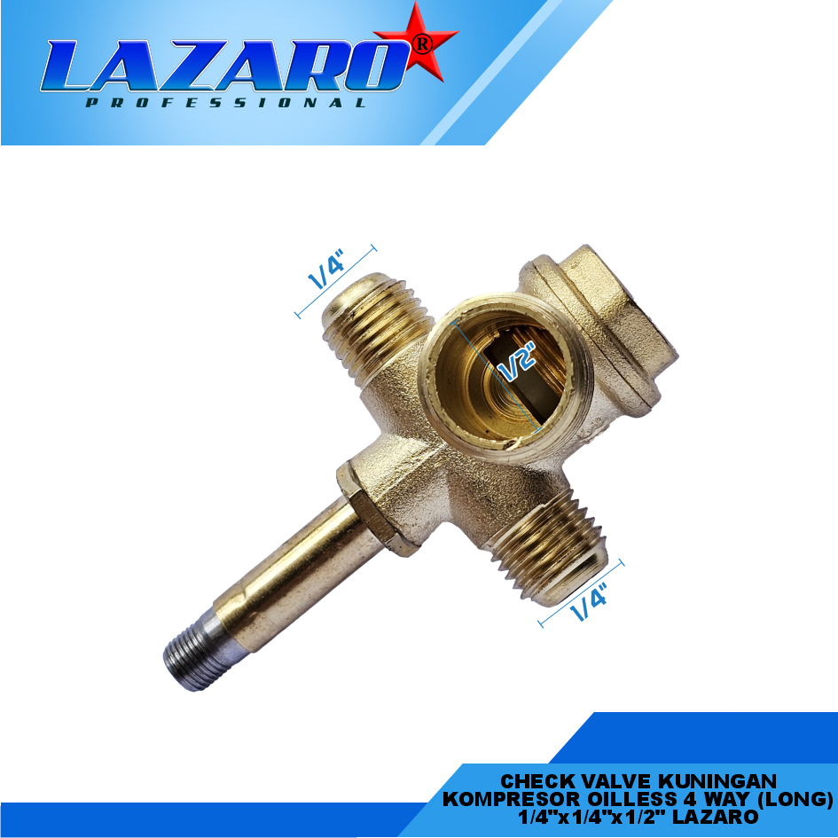 Lazaro Check Valve Brass 4 Way Oilless Compressor (long) 1/4"x1/4"x1/2"