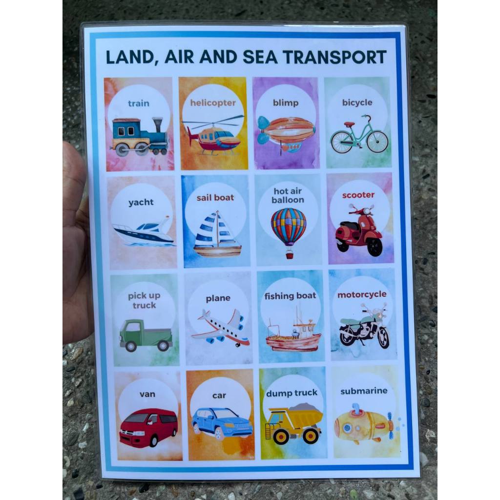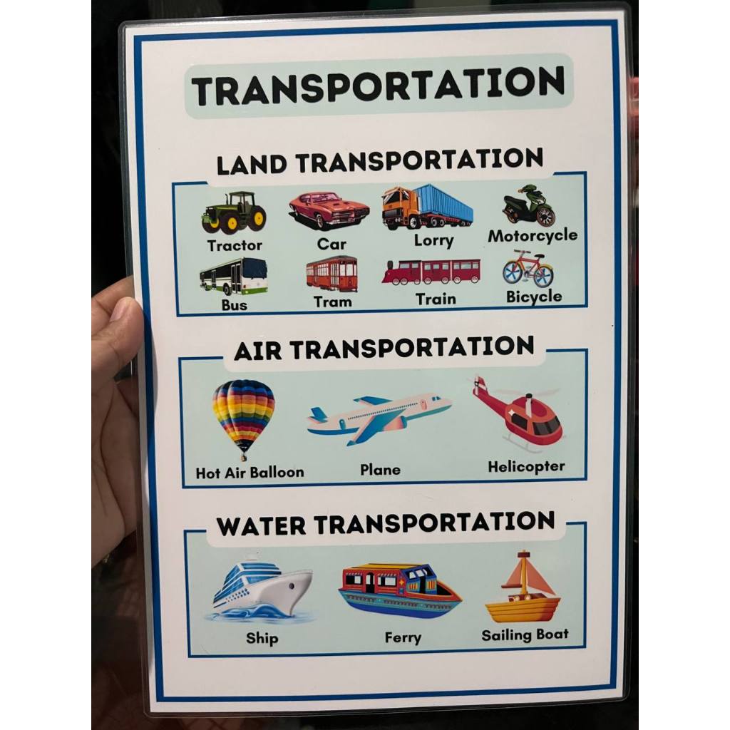 Learning materials and educational chart for kids Laminated A4 Size TRANSPORTATION