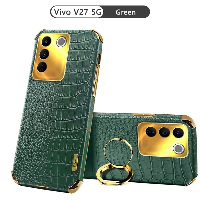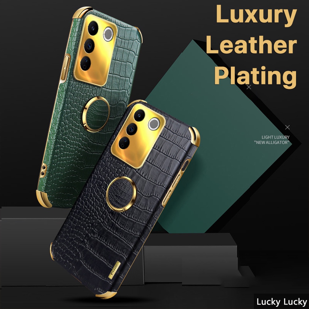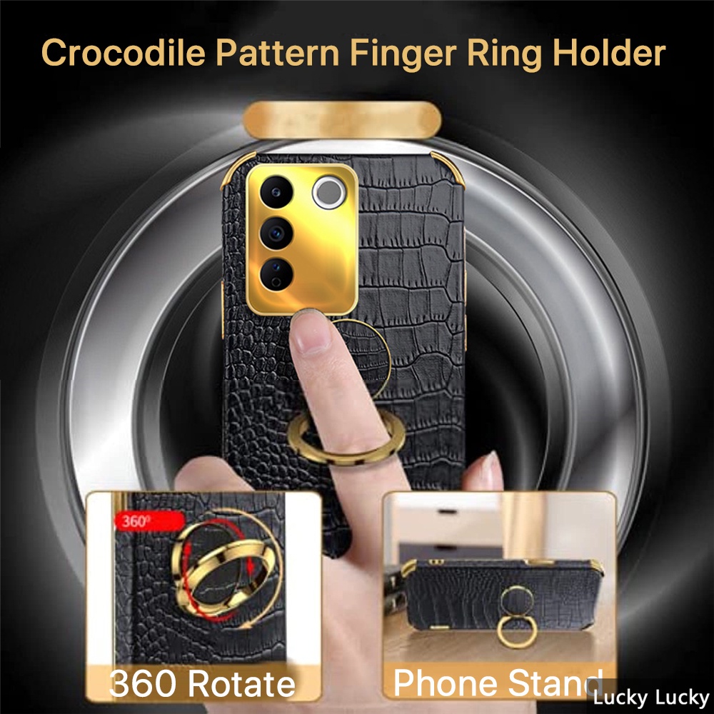 Leather Vivo V27 5G Case V27E V29 V25E V25 Pro V23E V23 5G V21 5G V20 Pro Case Soft Shockproof Crocodile Pattern Finger Ring Stand Holder Full Protect Camera Gold Plating Slim