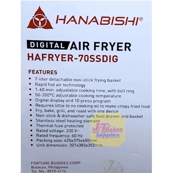 Hanabishi Non-stick Digital Air Fryer 7 Liter HAFRYER70SSDIG with Freebie