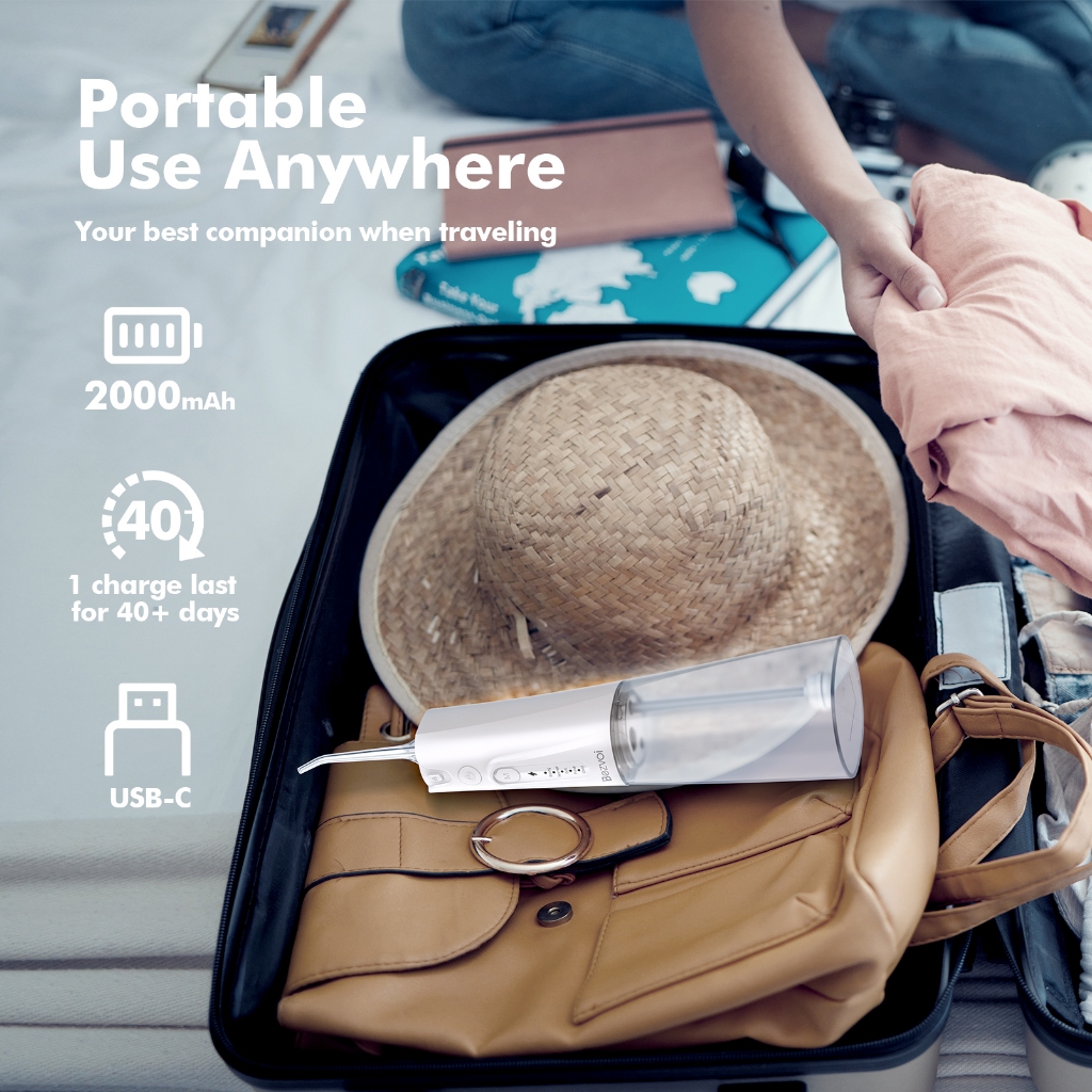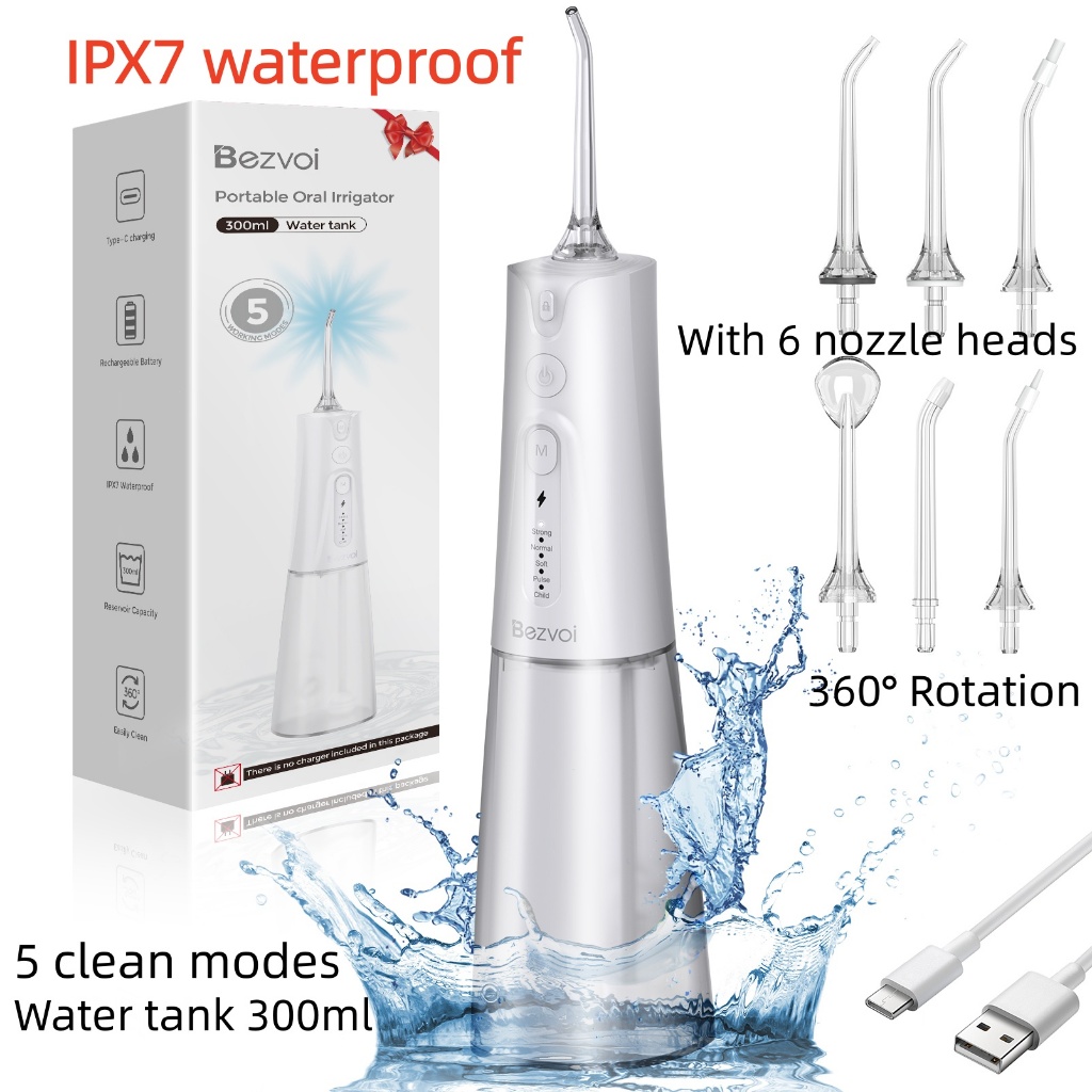 Bezvoi Y207 White Water Flosser : Oral Irrigator with 5 Modes, 300ML Water Tank IPX7 Waterproof Electric Tooth Cleaner, with 360° Rotatable 6 Tips nozzle Dental Care Cleaning