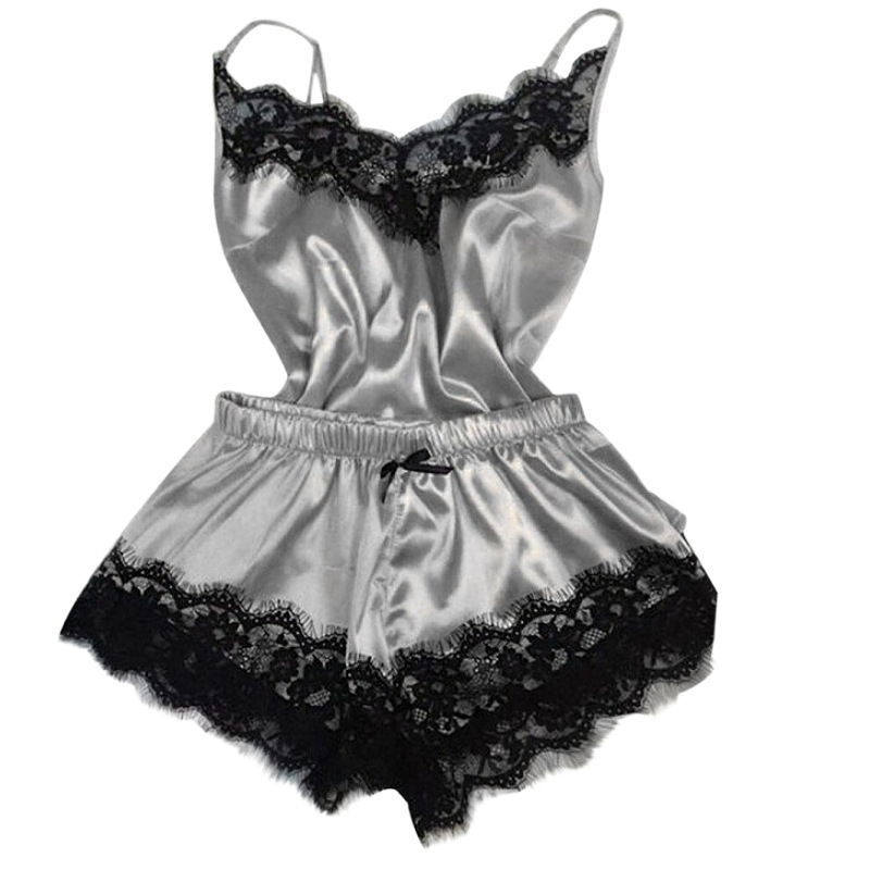 Ice silk Pajama Set Sexy Lingerie For Women Sleeveless Sleepwear Strap Nightwear Lace Trim Satin Cam