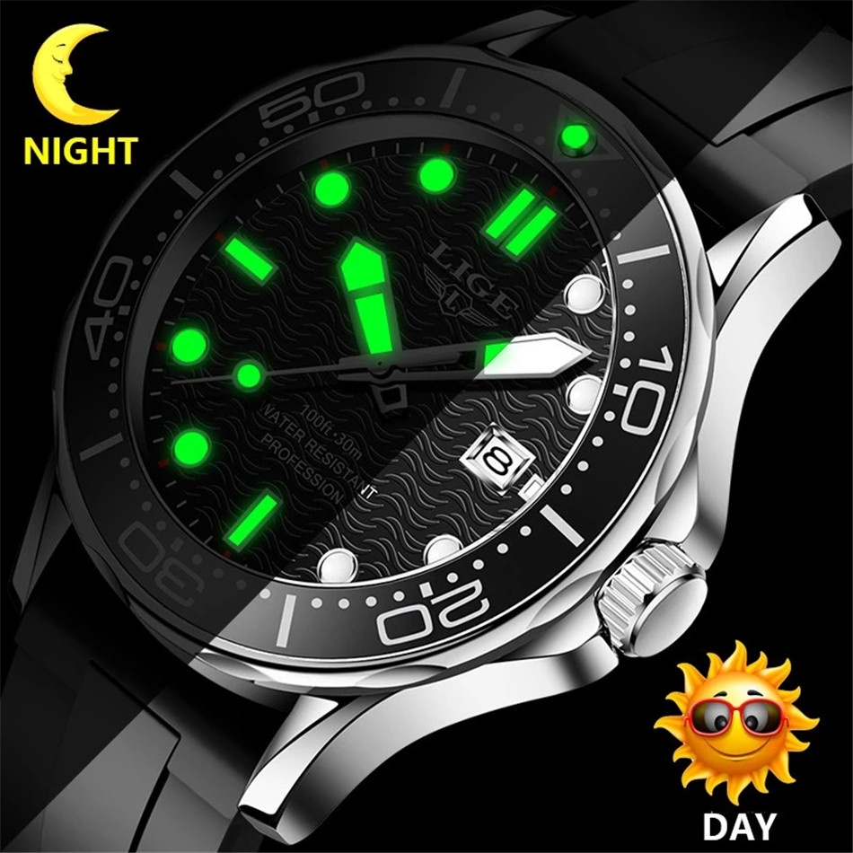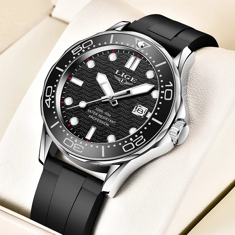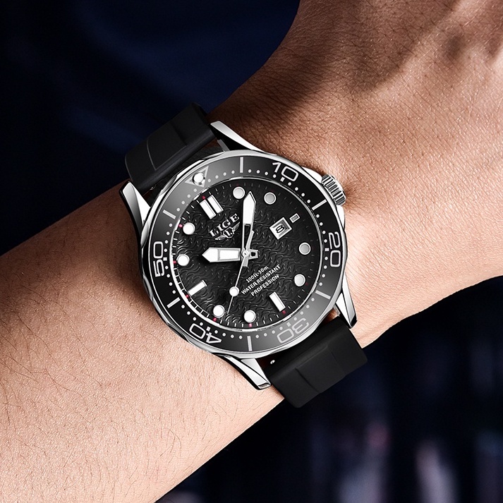 Lige Watch Male Waterproof Rubber Strap Fashion Rotating Frame Men's Quartz Watch