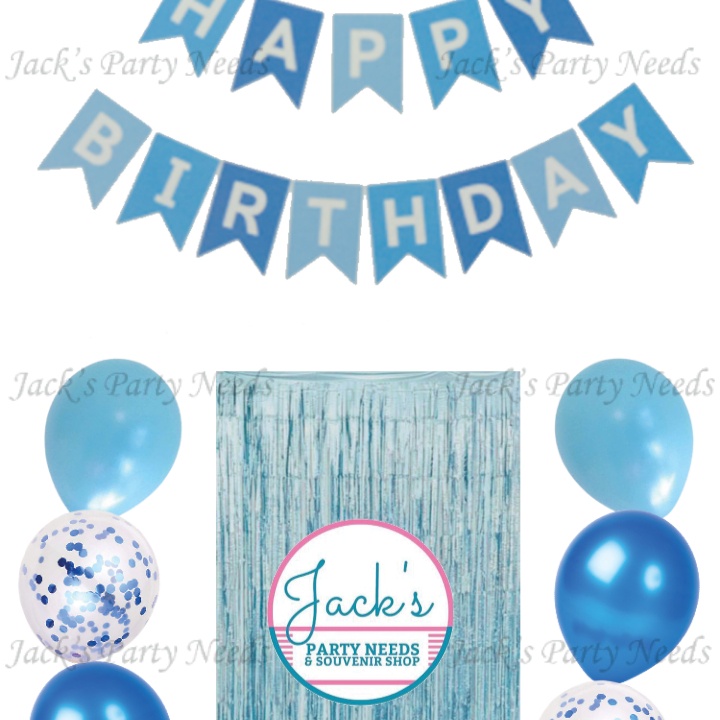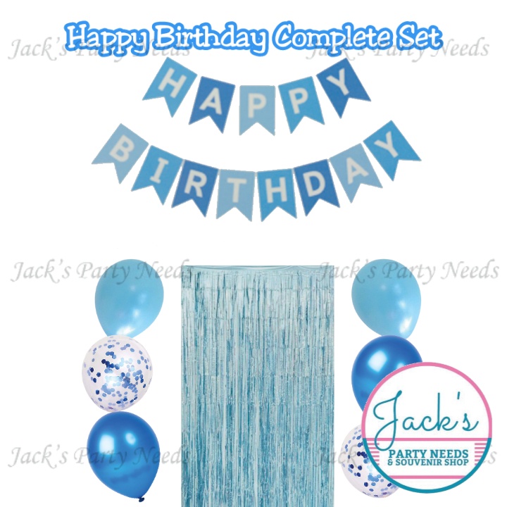Light Blue Happy Birthday complete set with 1 pc foil curtain, banner, latex and confetti balloons