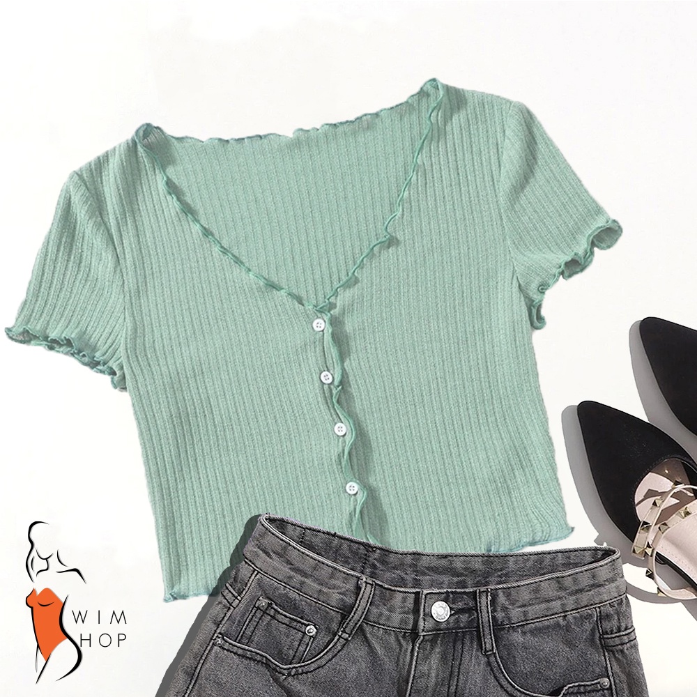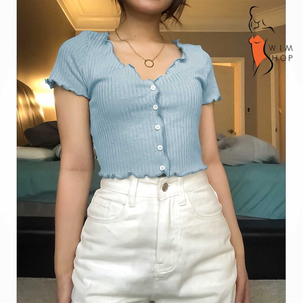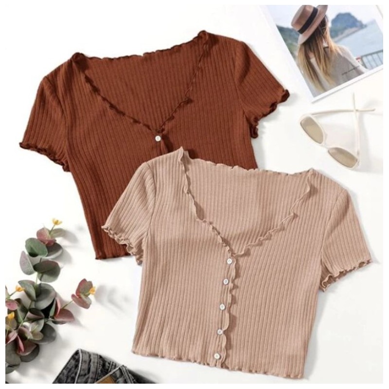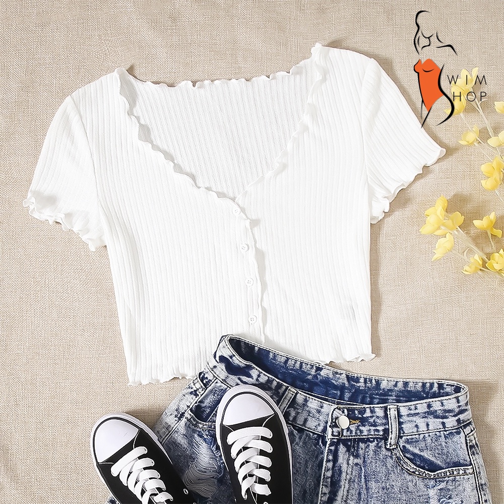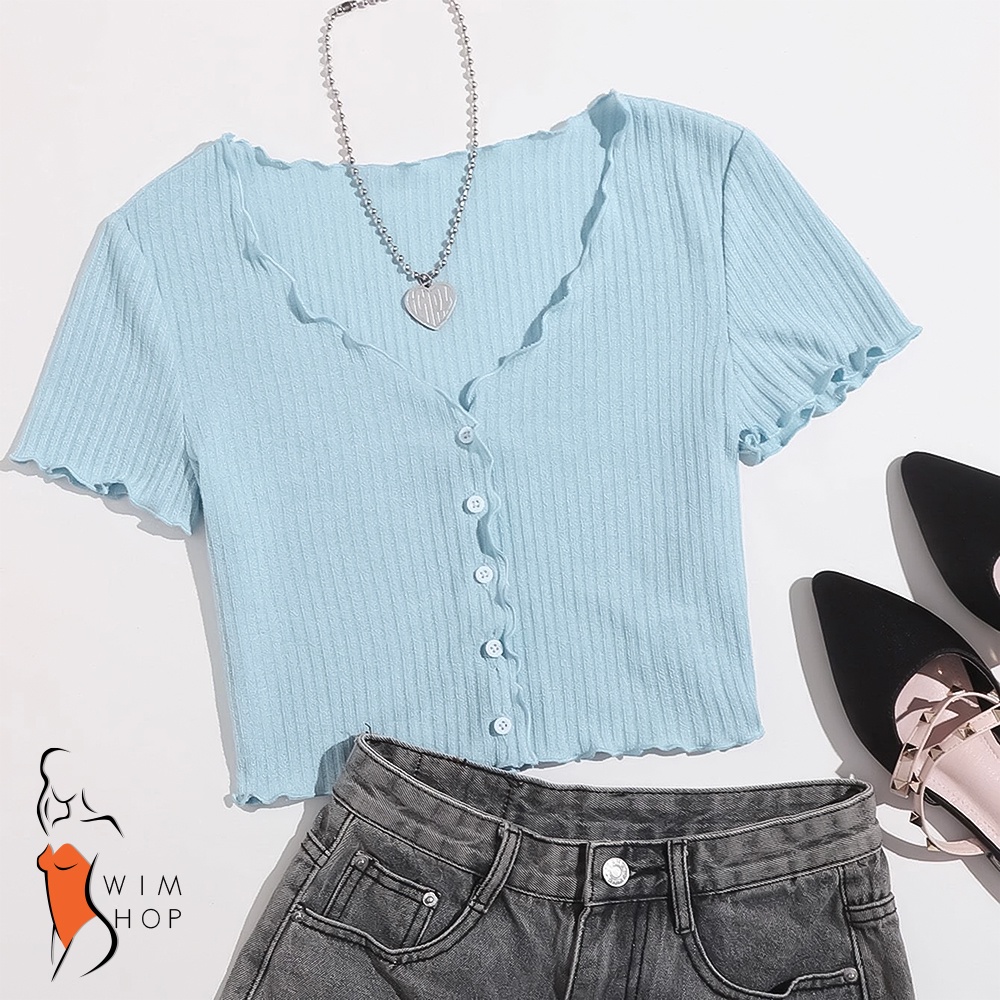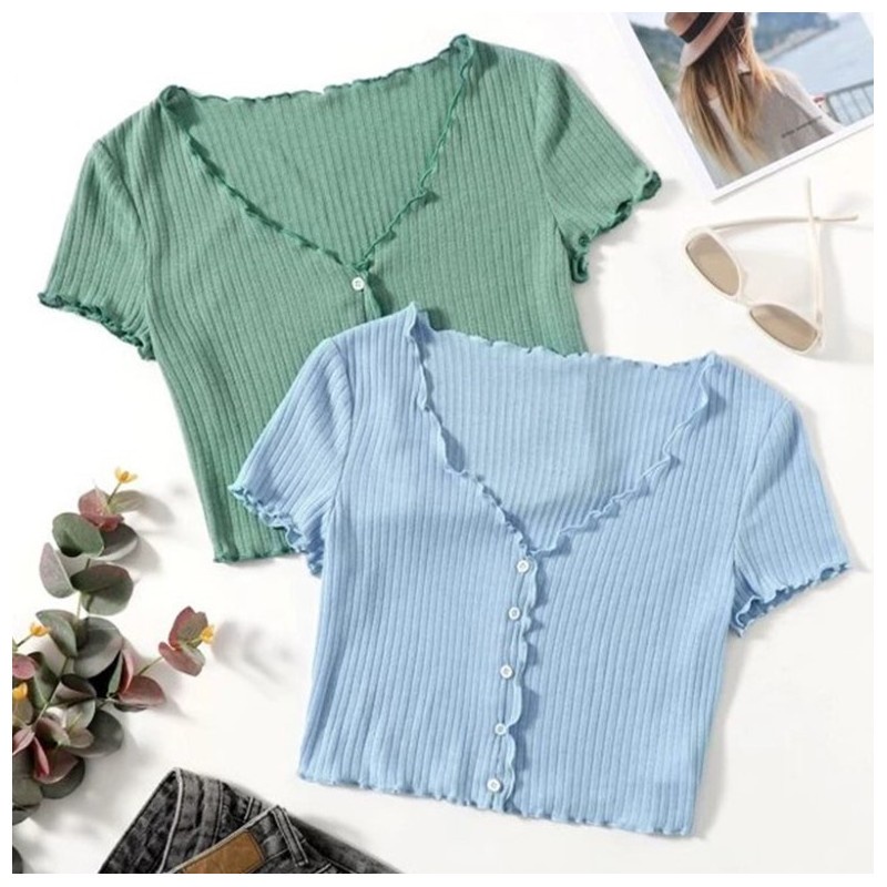 SS TIMI Button Lettuce Tops Trim Waffle Cotton Knit Crop Top wt0175
