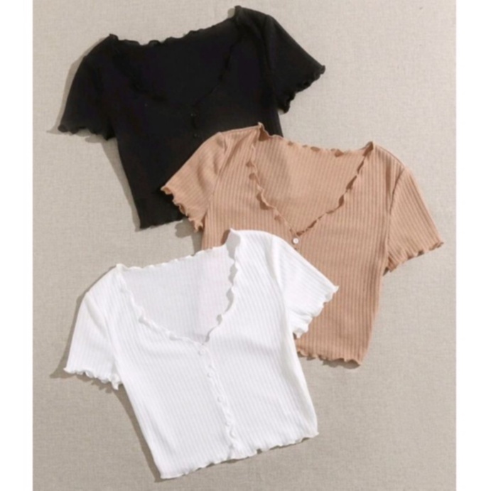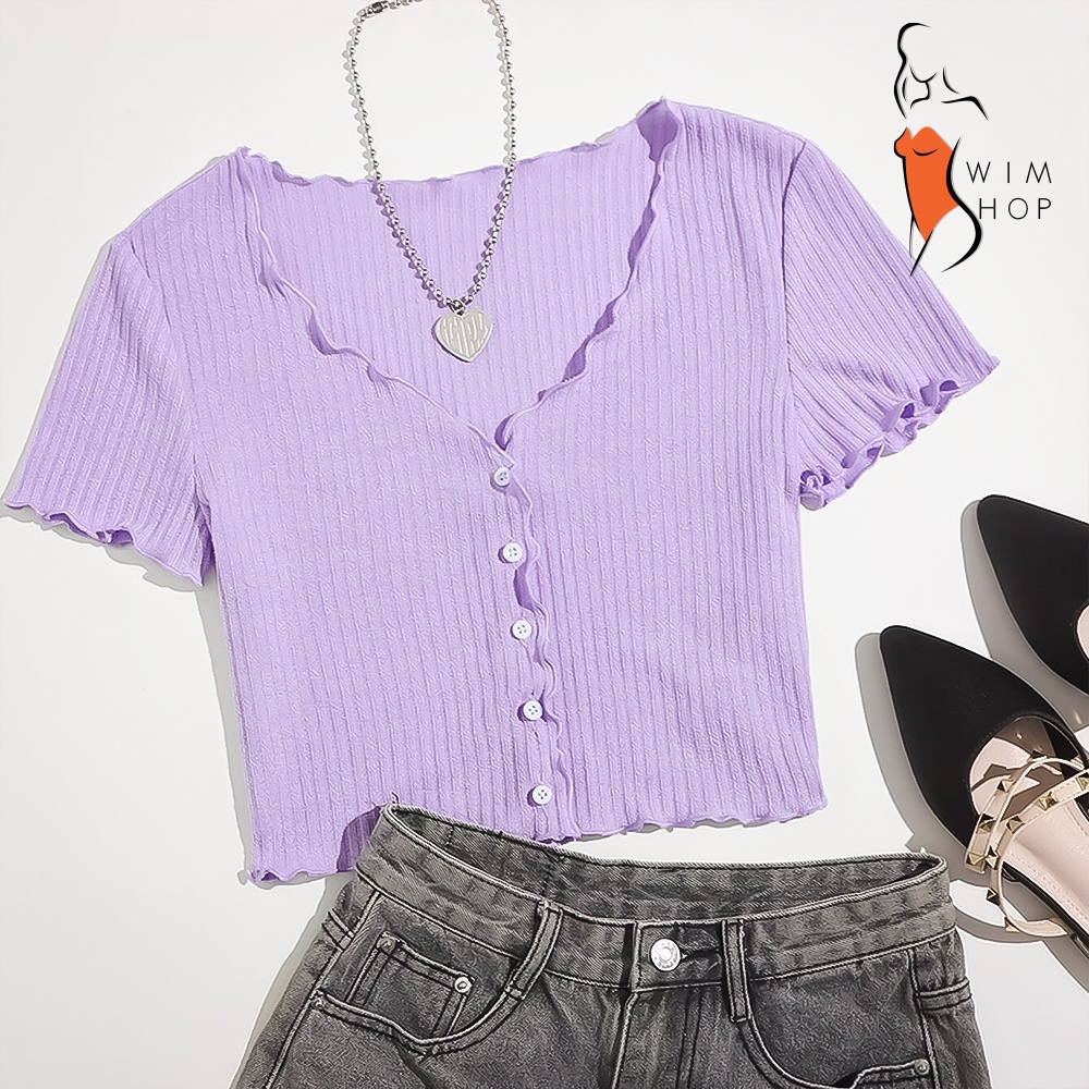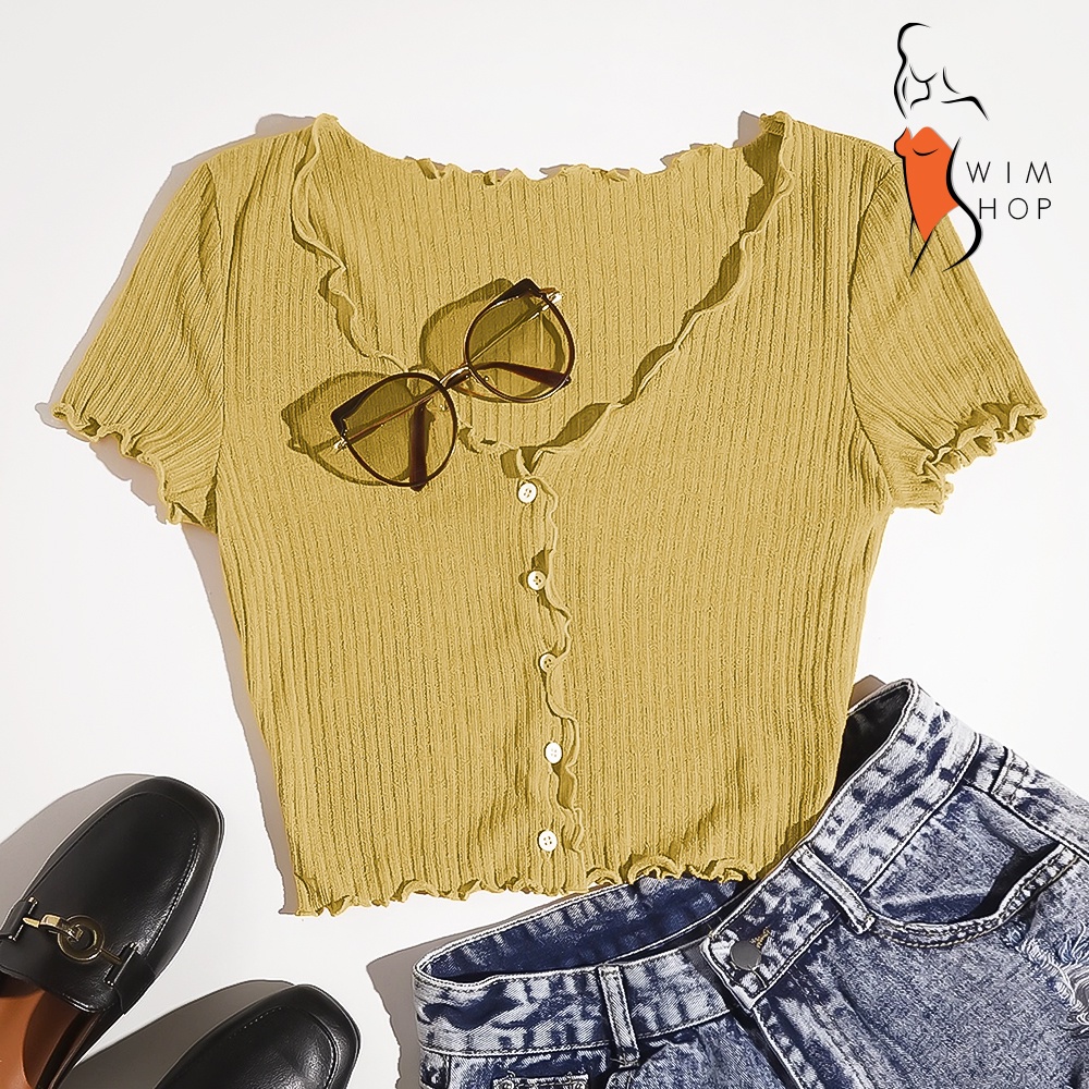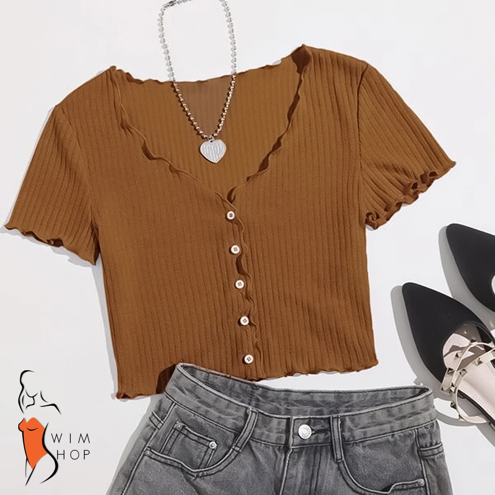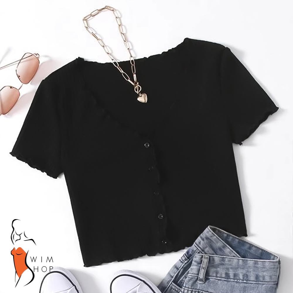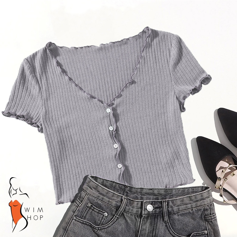 SS TIMI Button Lettuce Tops Trim Waffle Cotton Knit Crop Top wt0175