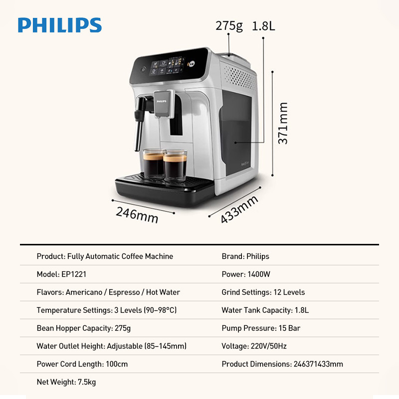 Philips Coffee Maker 12 Adjustable Grind Fully Automatic Coffee Machine EP1221 Suitable for Home or Office Use