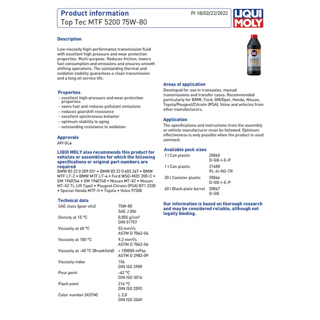 Liqui Moly Top Tec MTF 5200 75W80 Transmission Fluid (1 Liter)