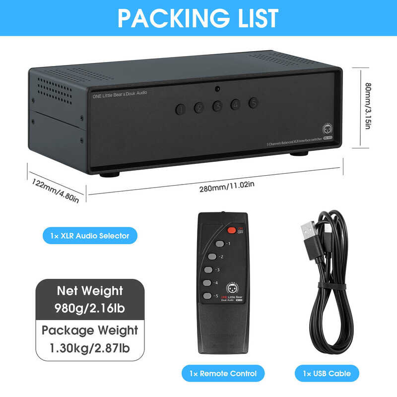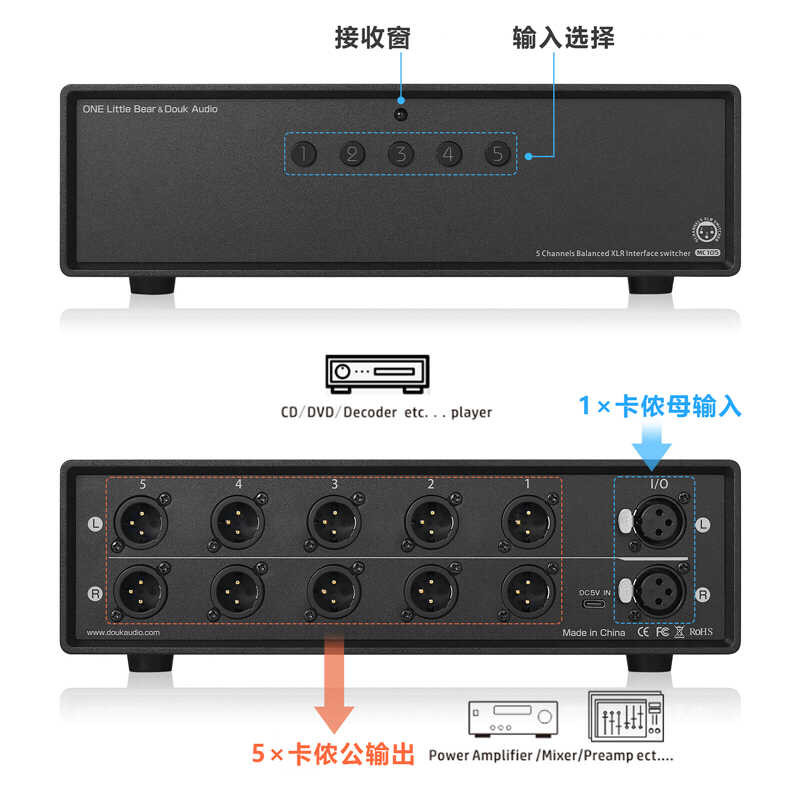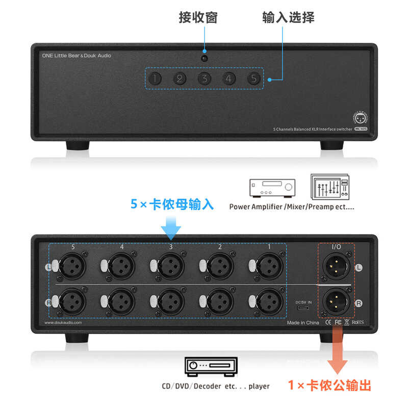 Little Bear 1-in-5-out/5-in-1-out XLR balanced passive selector audio switcher 5-way distributor
