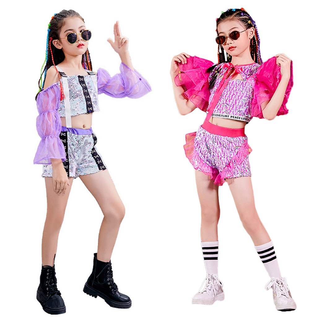 Lolanta Kids Fashion Girls Hip Hop Outfit Korean Crop Top Shorts Set Street Jazz Dance Clothes School Stage Sequins Performance Costume Birthday Gift Wear 5-15 Years