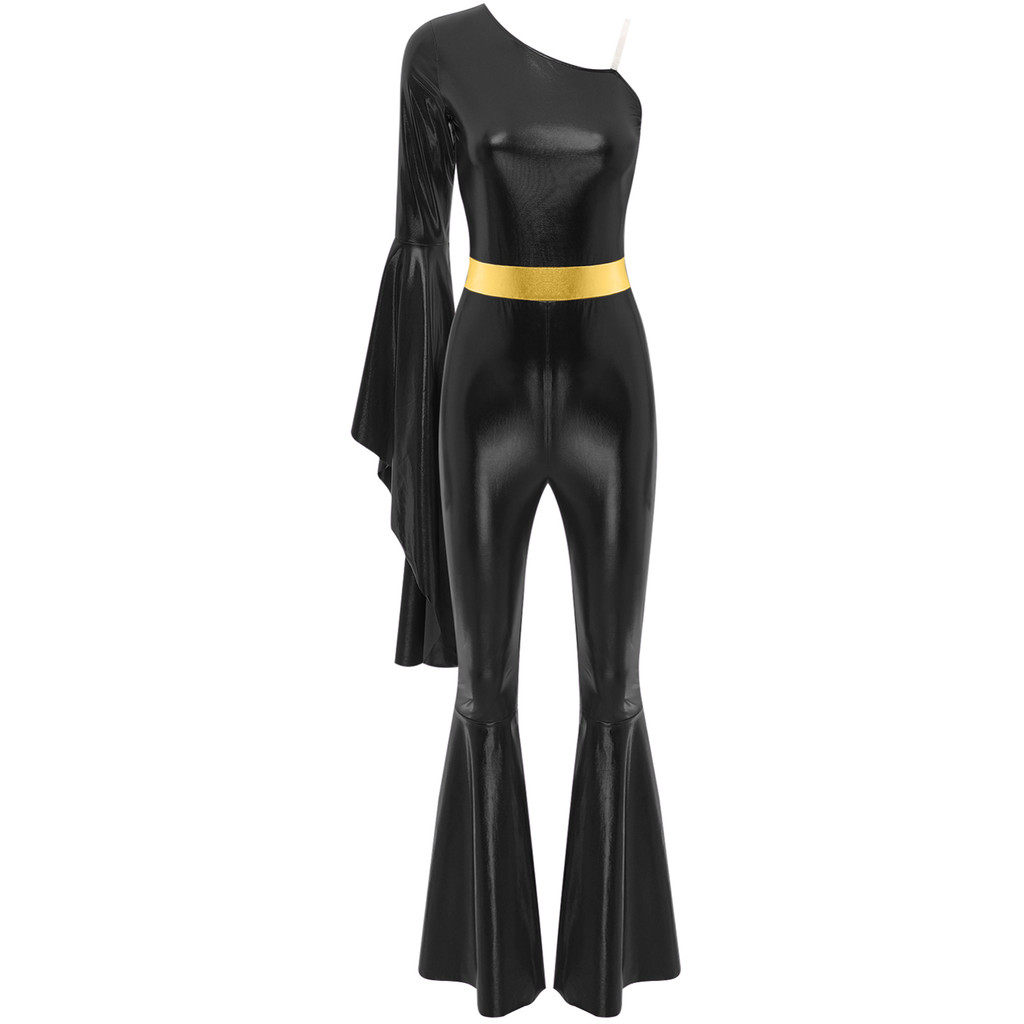 Lorilida Women 70s Disco Dance Costume One Shoulder Single Long Sleeve Bodysuit Flared Bell Shiny Metallic Funky Dancewear