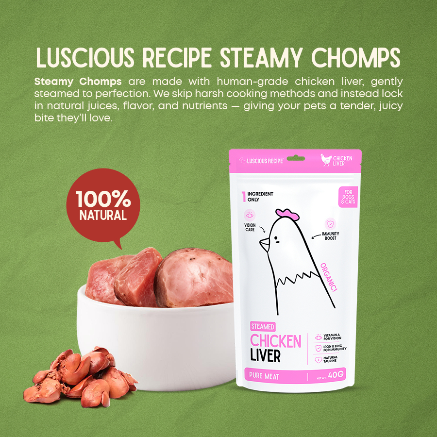 Luscious Recipe Steamy Chomps Pure Meat Chicken Liver Steamed Chomps For Dogs and Cats Food Topper