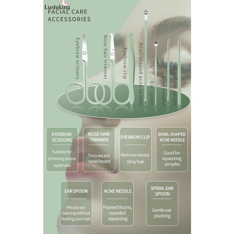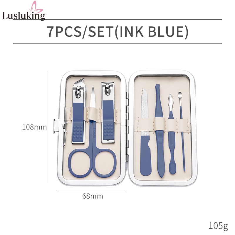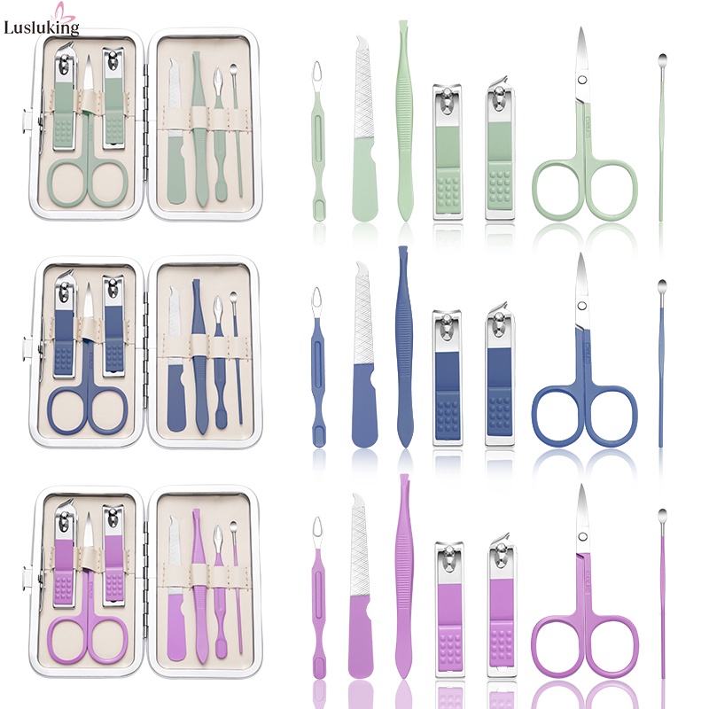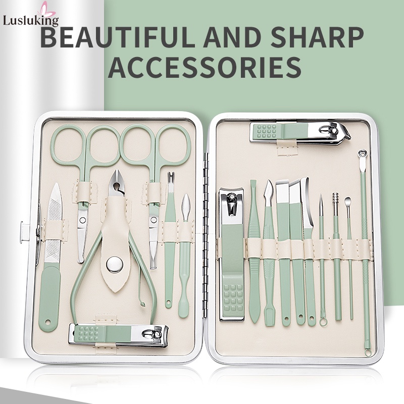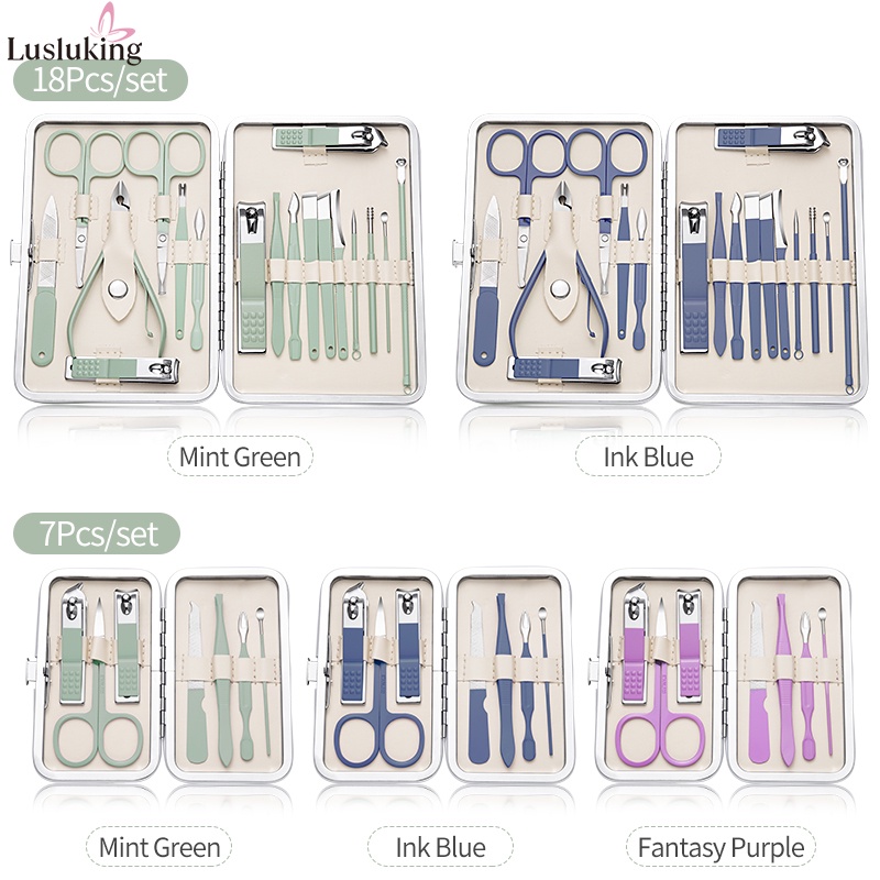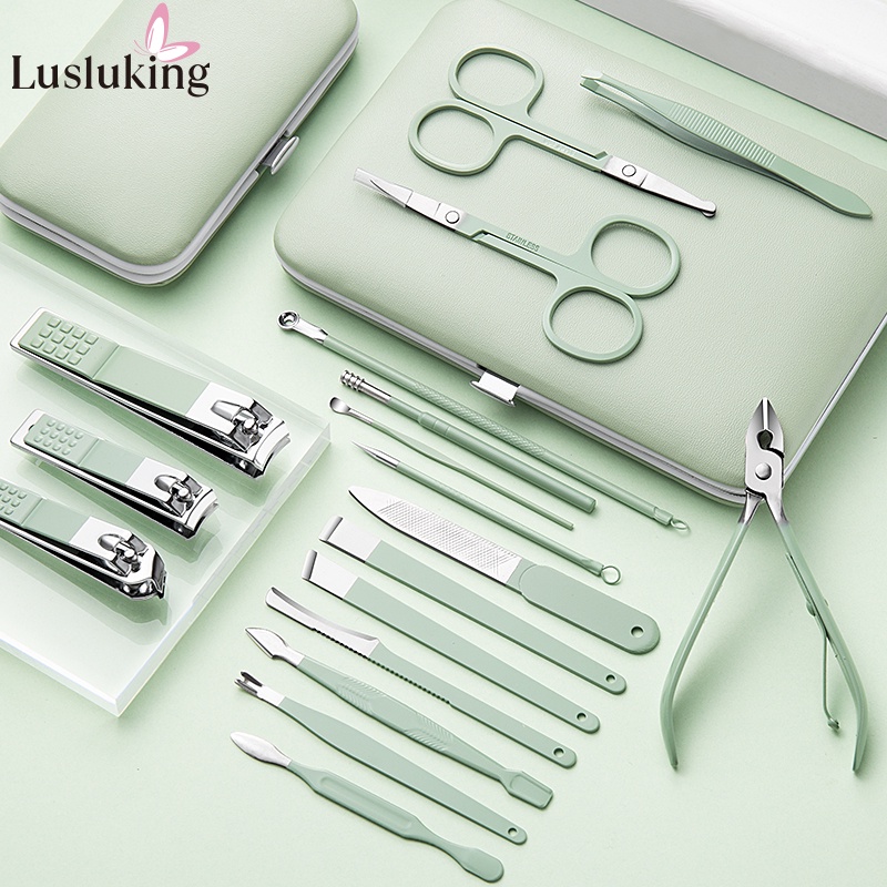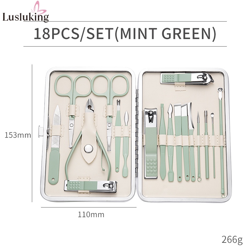 Lusluking 7 18 Pcs In Set Green Leather Case Nail Clipper Manicure Cutter Nipper Pedicure Scissors Dead Skin Pliers Toenail Cleaner Stainless Steel Tool