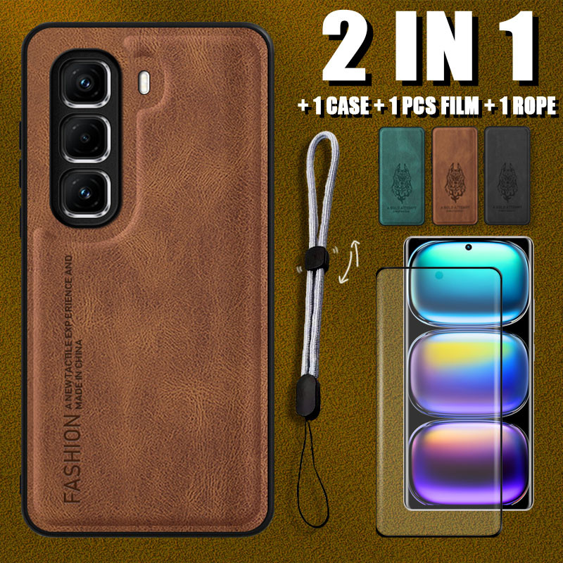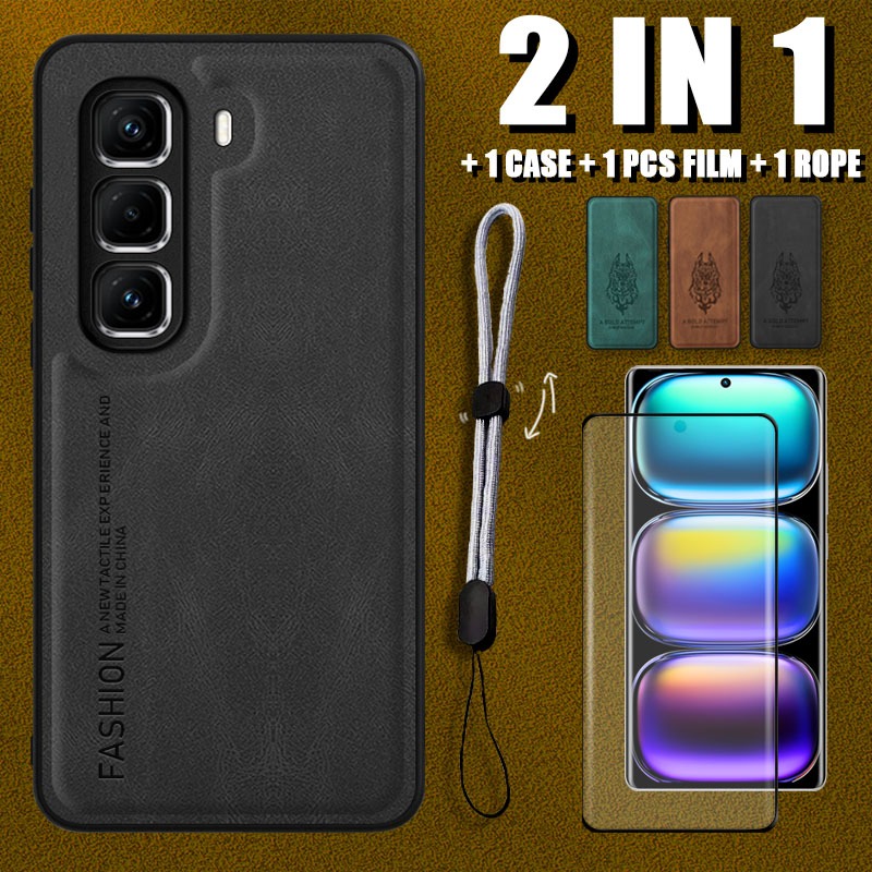Luxury Leather Case 2 IN 1 For Infinix Hot 50 Pro Plus 50 Pro+ 4G X6880 with Ceramic Screen Protector and Adjustable Mobile phone lanyard
