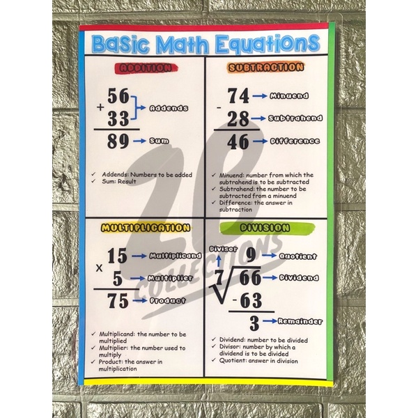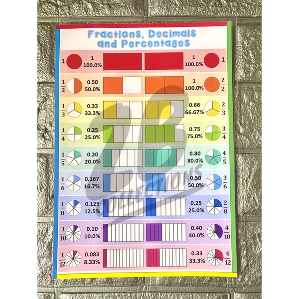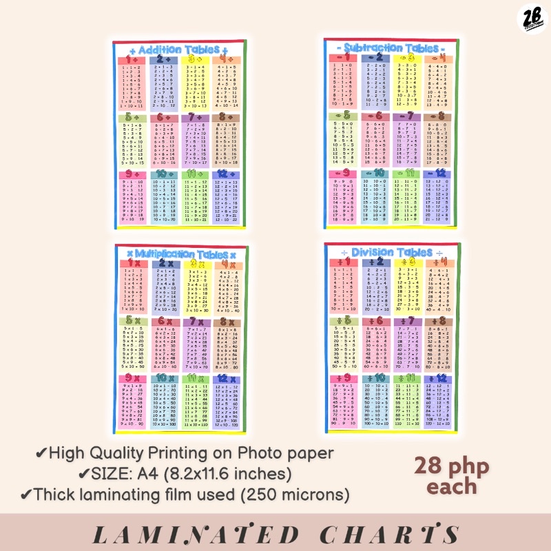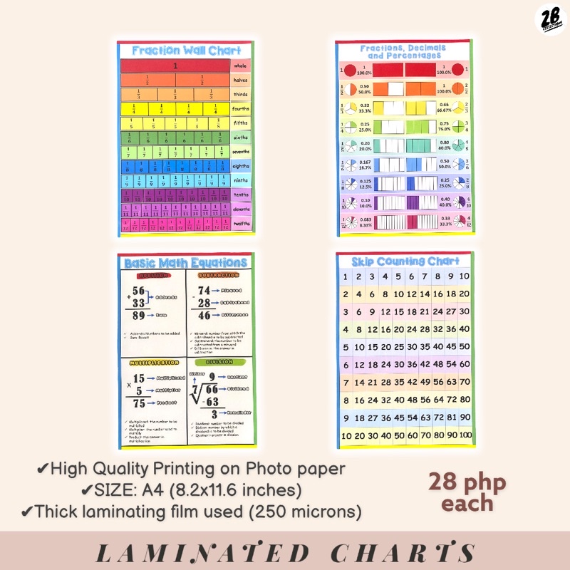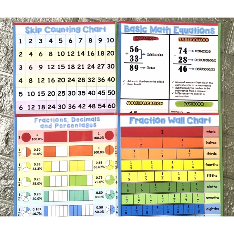 MATH CHARTS-Laminated (add, subtract, multipy, divide, fractions, decimals)
