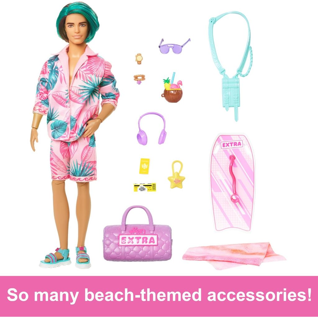 MATTEL Barbie Extra Fly Ken Doll with Beach-Themed Clothes & Accessories Boogie Board & Duffel Bag