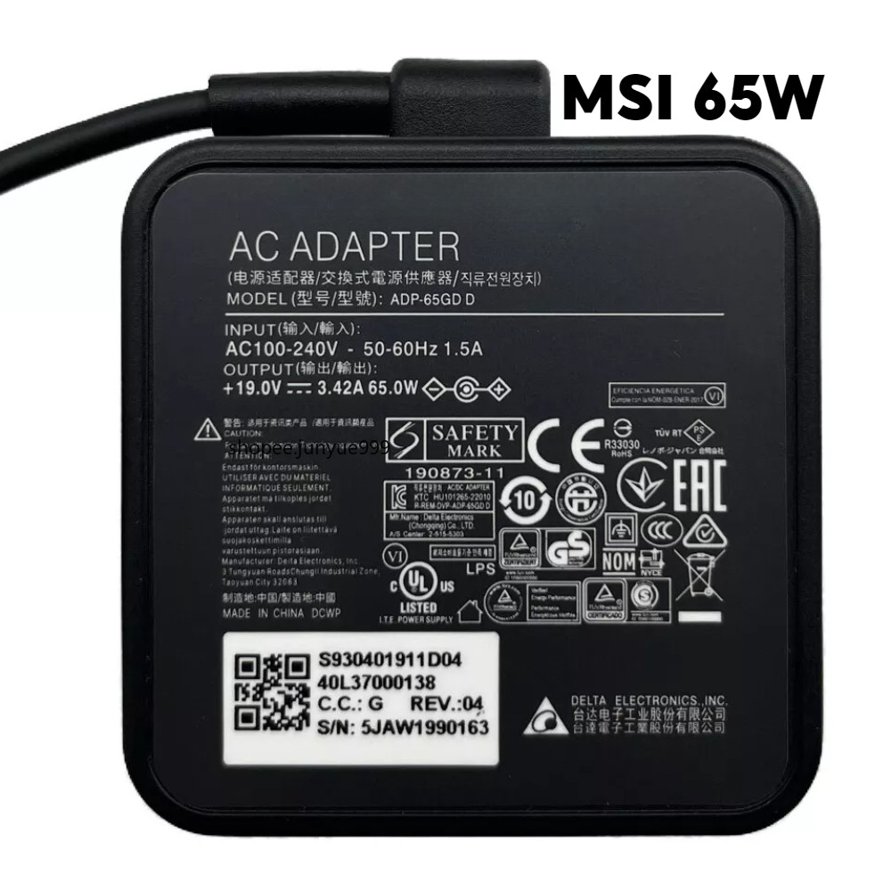 MSI Modern Series notebook 19V 3.42A 65W AC power adapter For Modern 14 15/Summit B15 B14 charger