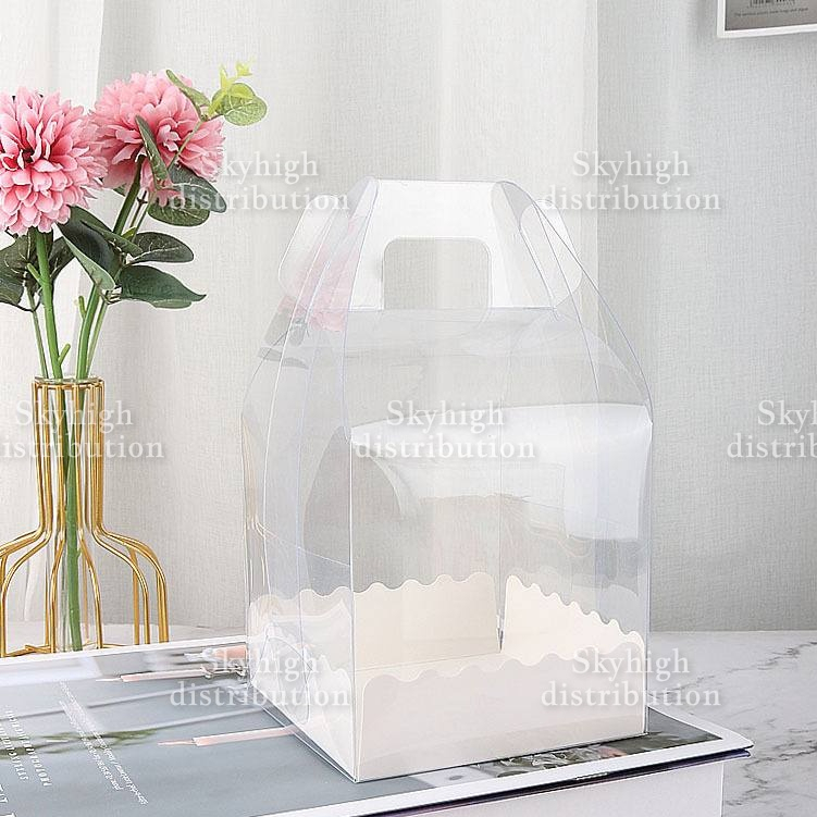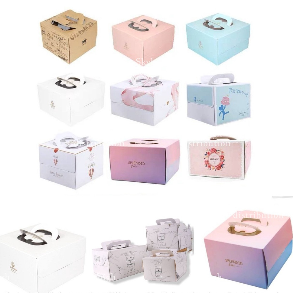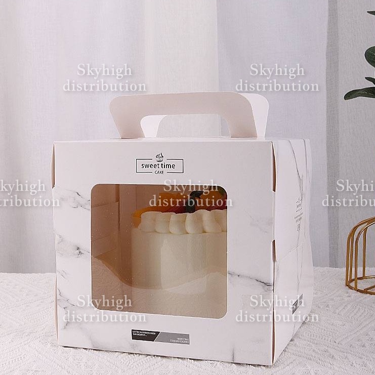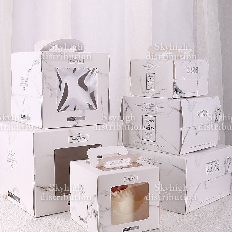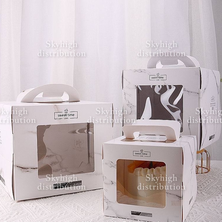 Marble Ombre White Bento & Acetate Cake Box Cardboard Square Cake Packaging w/ Handle SHD