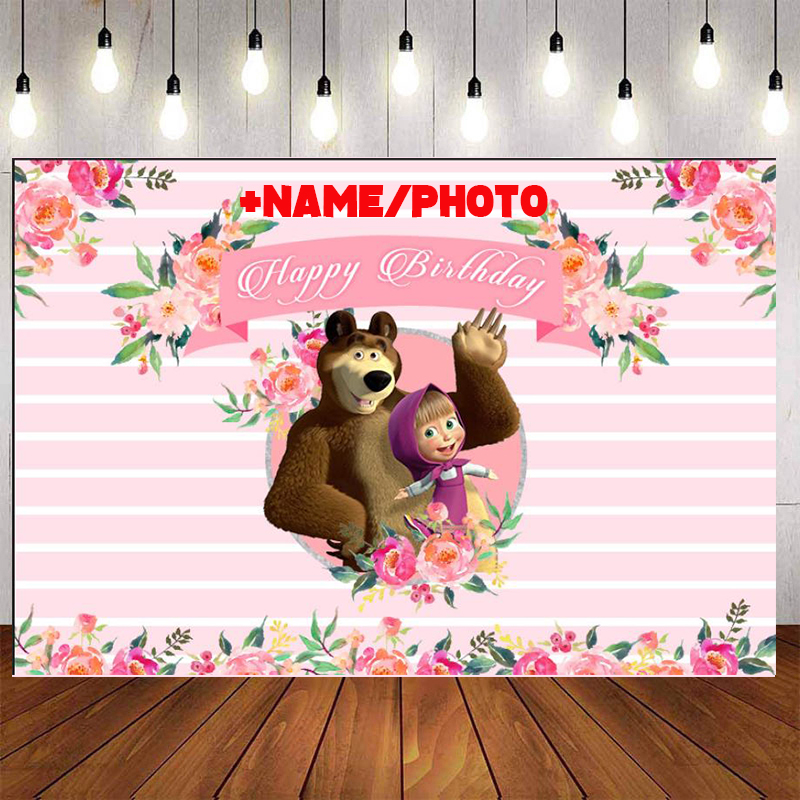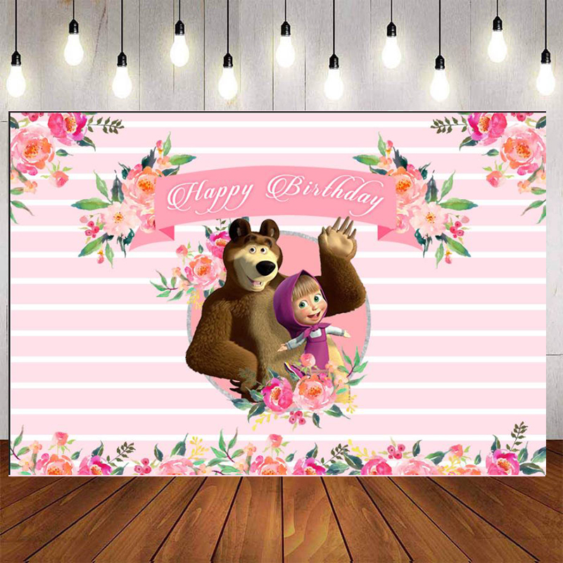 Masha and Bear Floral Birthday Backdrop Cartoon Characters Pink Stripes Flowers Photography Background for Children Party Decoration Custom Name Photo