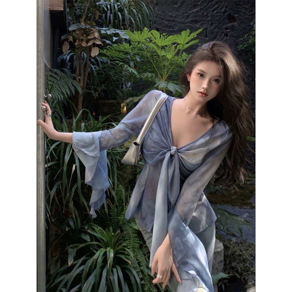 Blue Tie-Dye Ruffle Blouse for Women V Neck Korean Style Flare Long Sleeve Loose Casual Fashion Classy Elegant Fitted Ironless Ladies Shirt Top