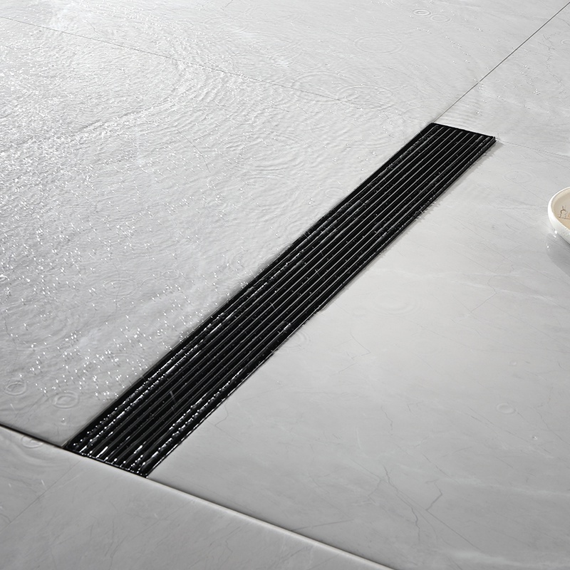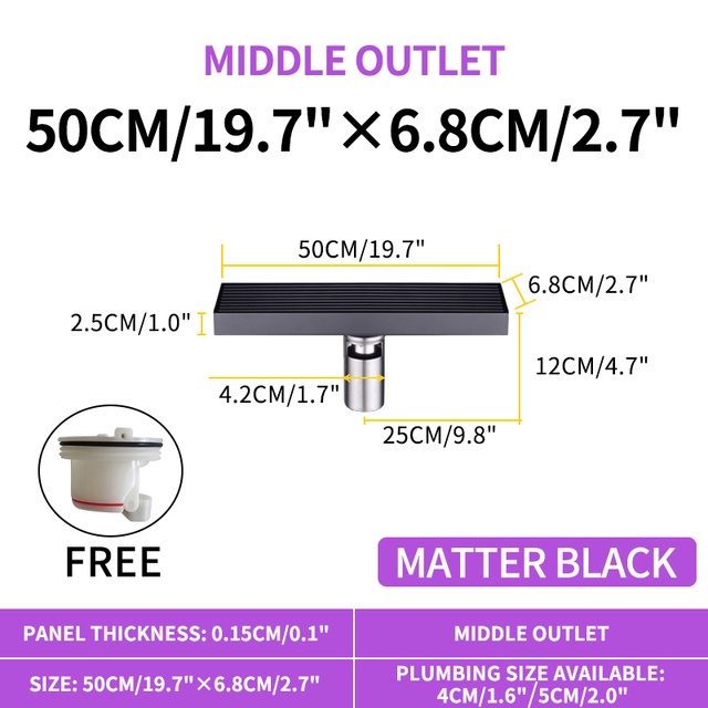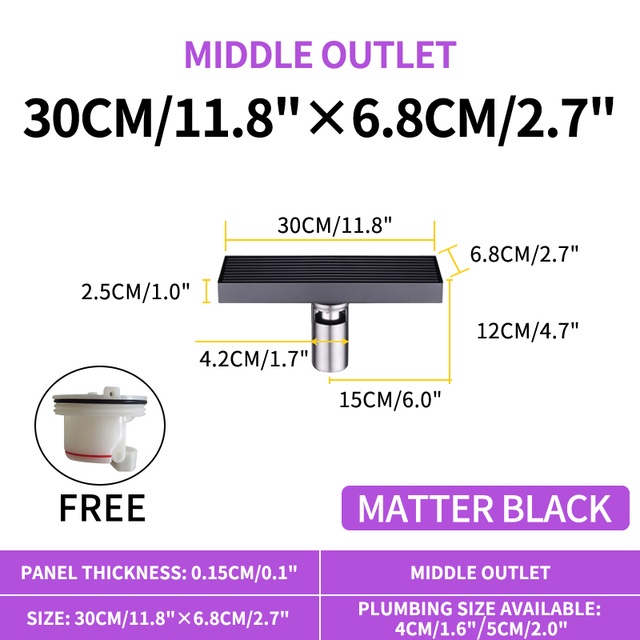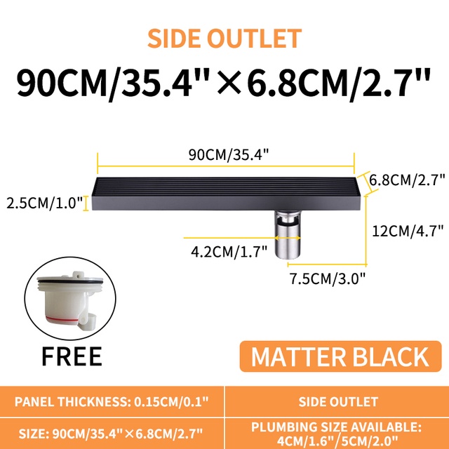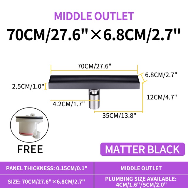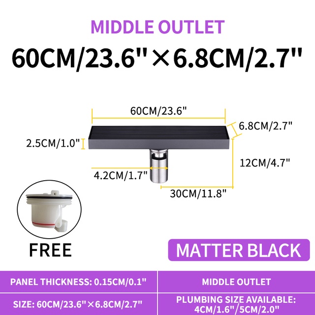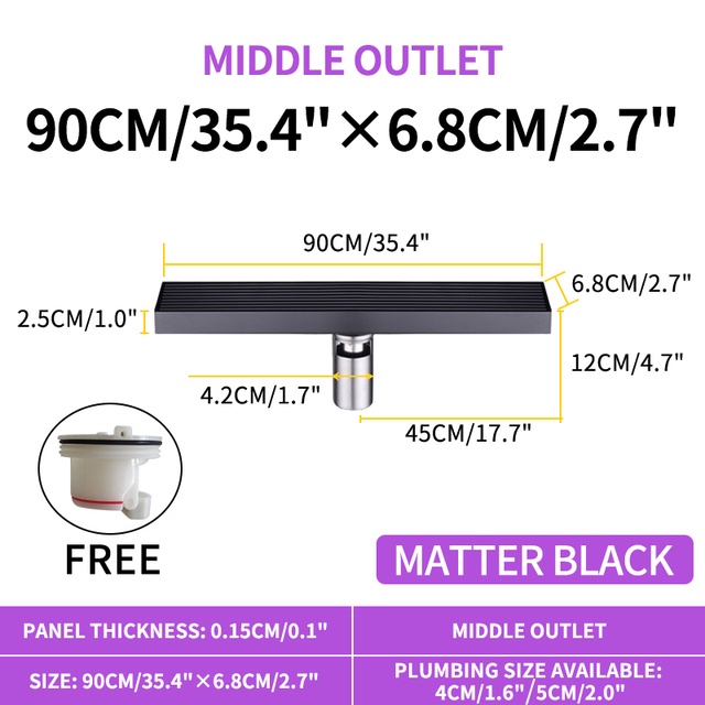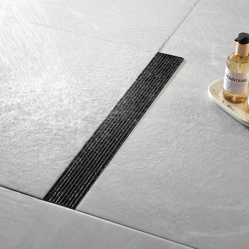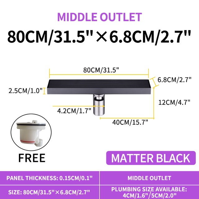 Matte Black Linear Shower Drain with Removable Grate Cover 304 Stainless Steel Shower Floor Drain Shower Drain with Hair Catcher 300mm - 900mm Bath Drain Odor Stop System