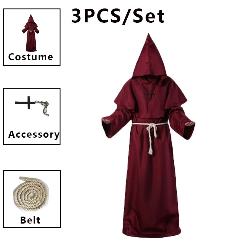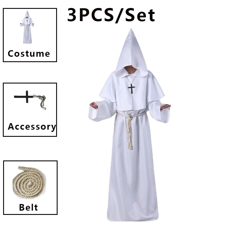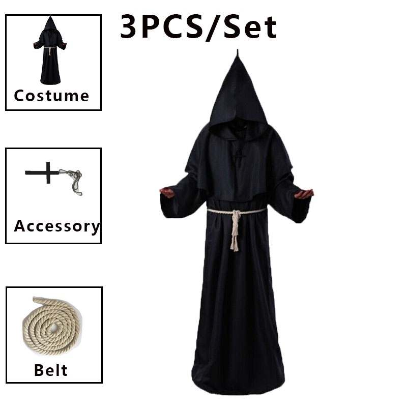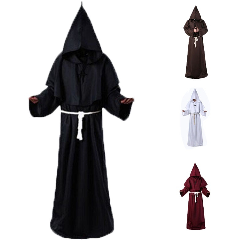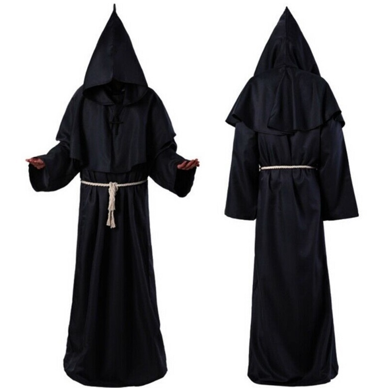 Medieval Monks Hooded Priest Robe Wizard Halloween Cosplay Costume Adult for Men Women