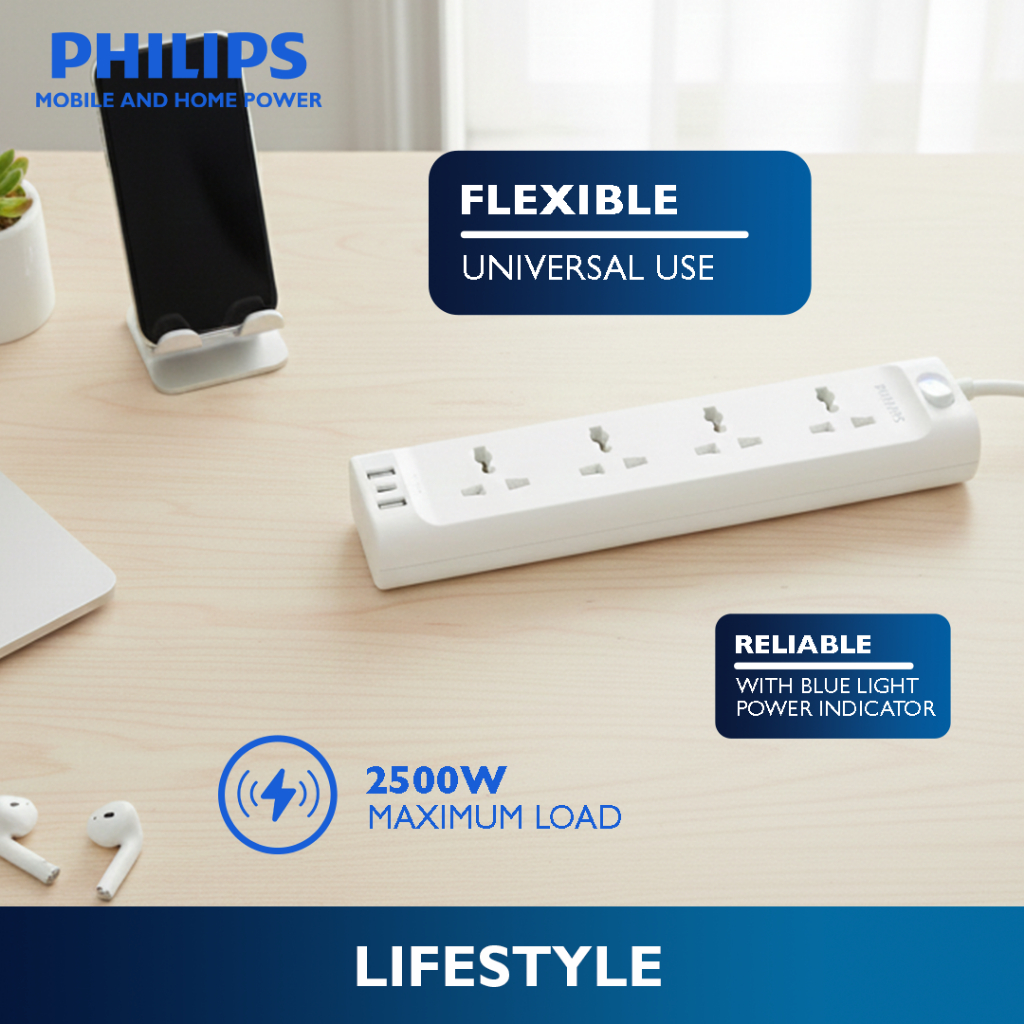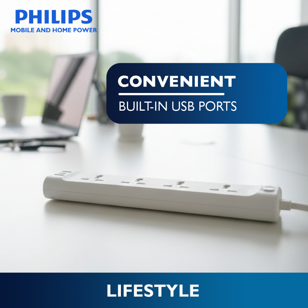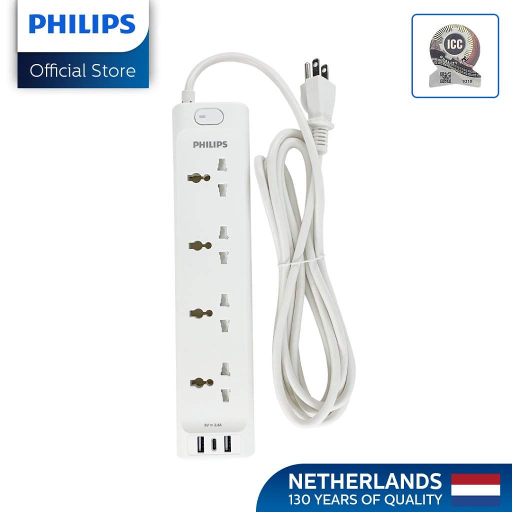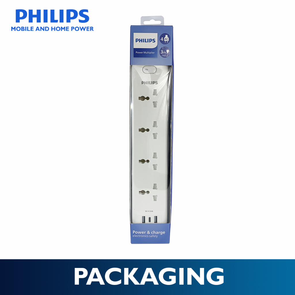 Philips 4 Universal Power Outlet with Integrated USB/USB-C Charging Port 3 Meters Extension