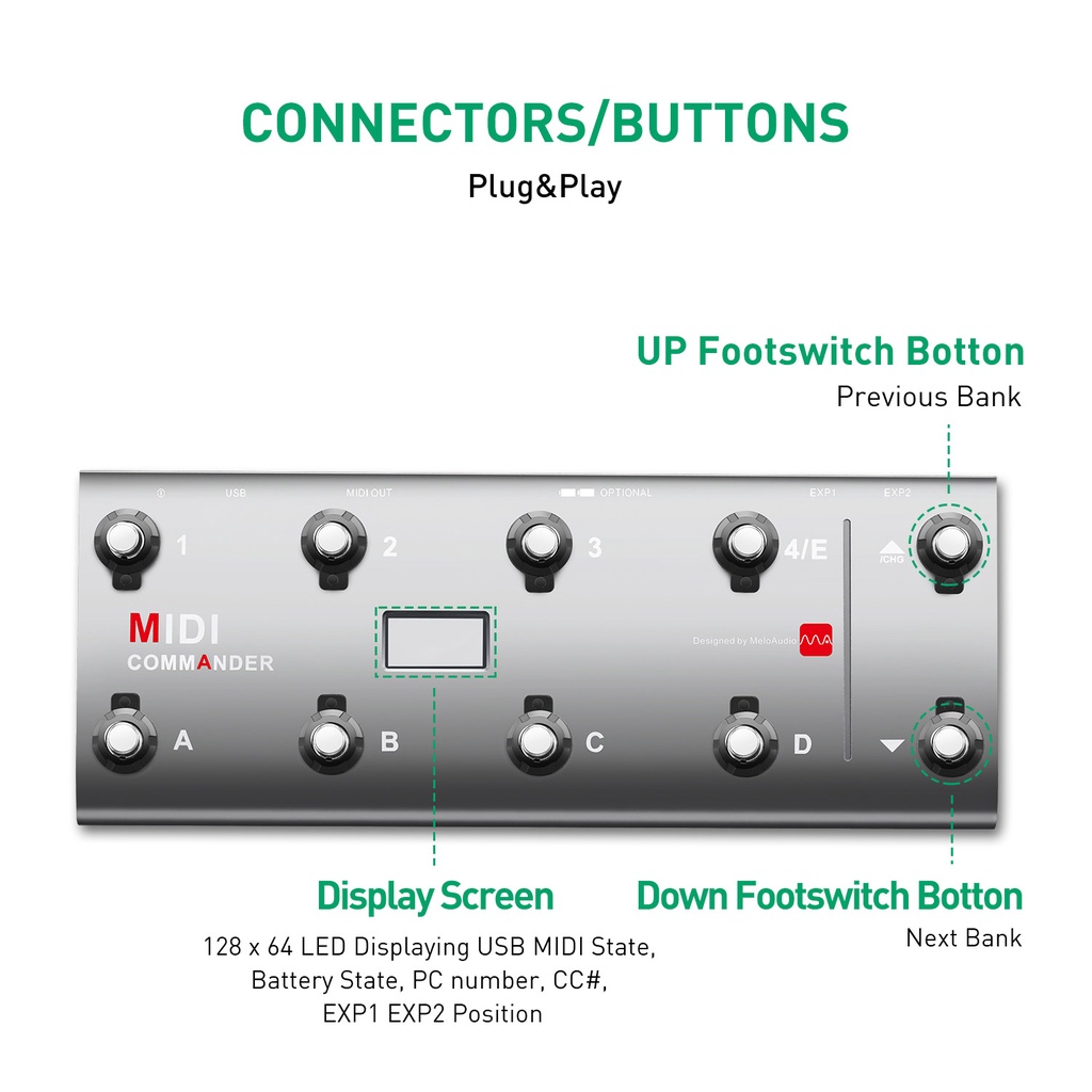 MeloAudio MIDI Commander Guitar Portable USB MIDI Foot Controller With 10 Foot Switches 2 Expression Pedal Jacks 8 Host Presets