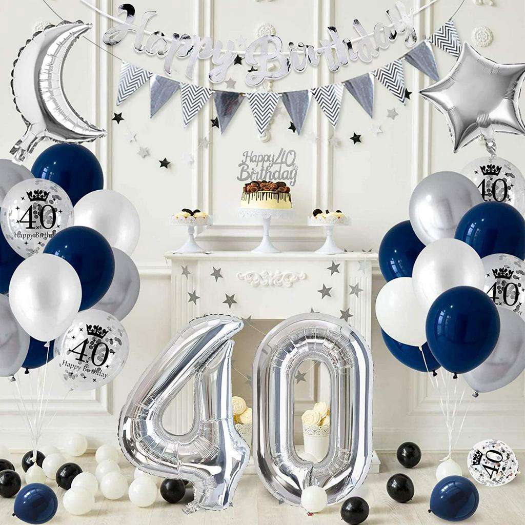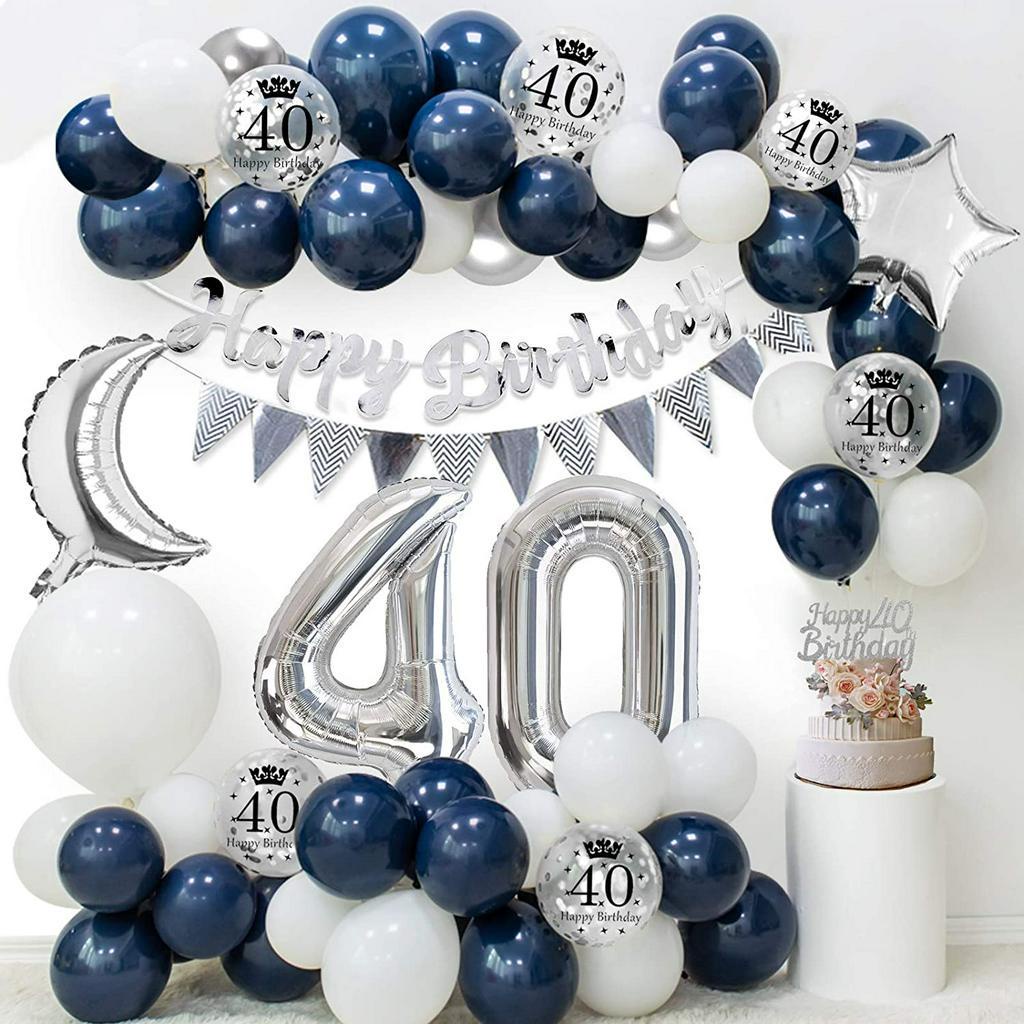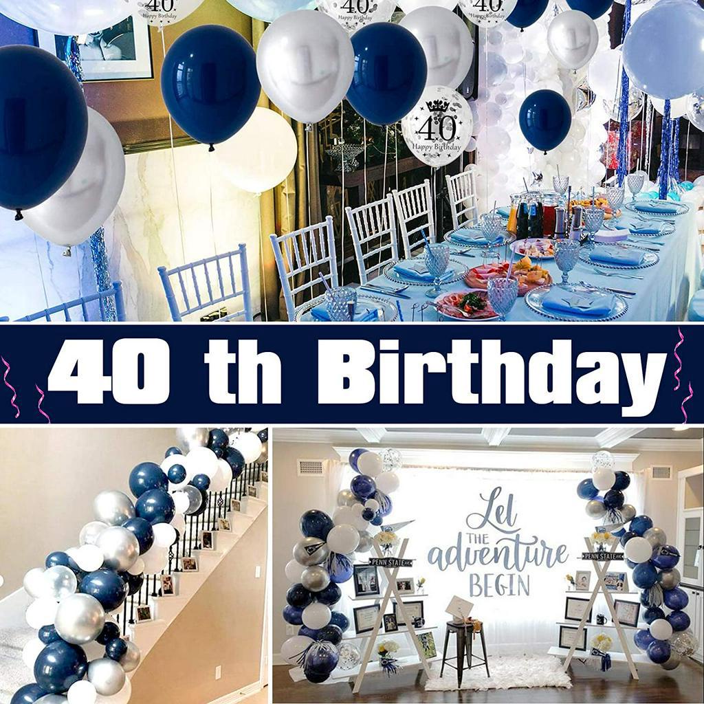 Men's 40th Birthday Decorations, Navy Blue White Balloons, Printed Silver Metallic Silver Balloons Foil Tablecloth Confetti Happy Birthday Banner Cake Decorations