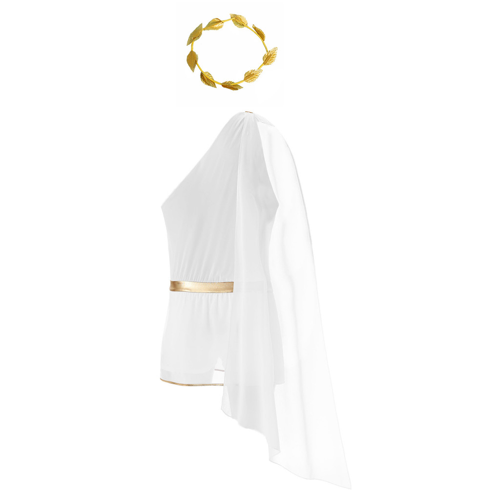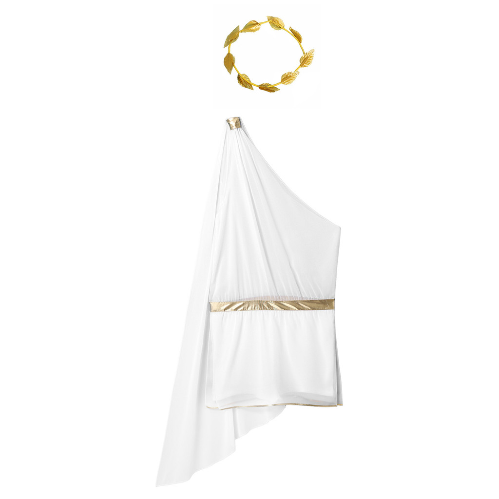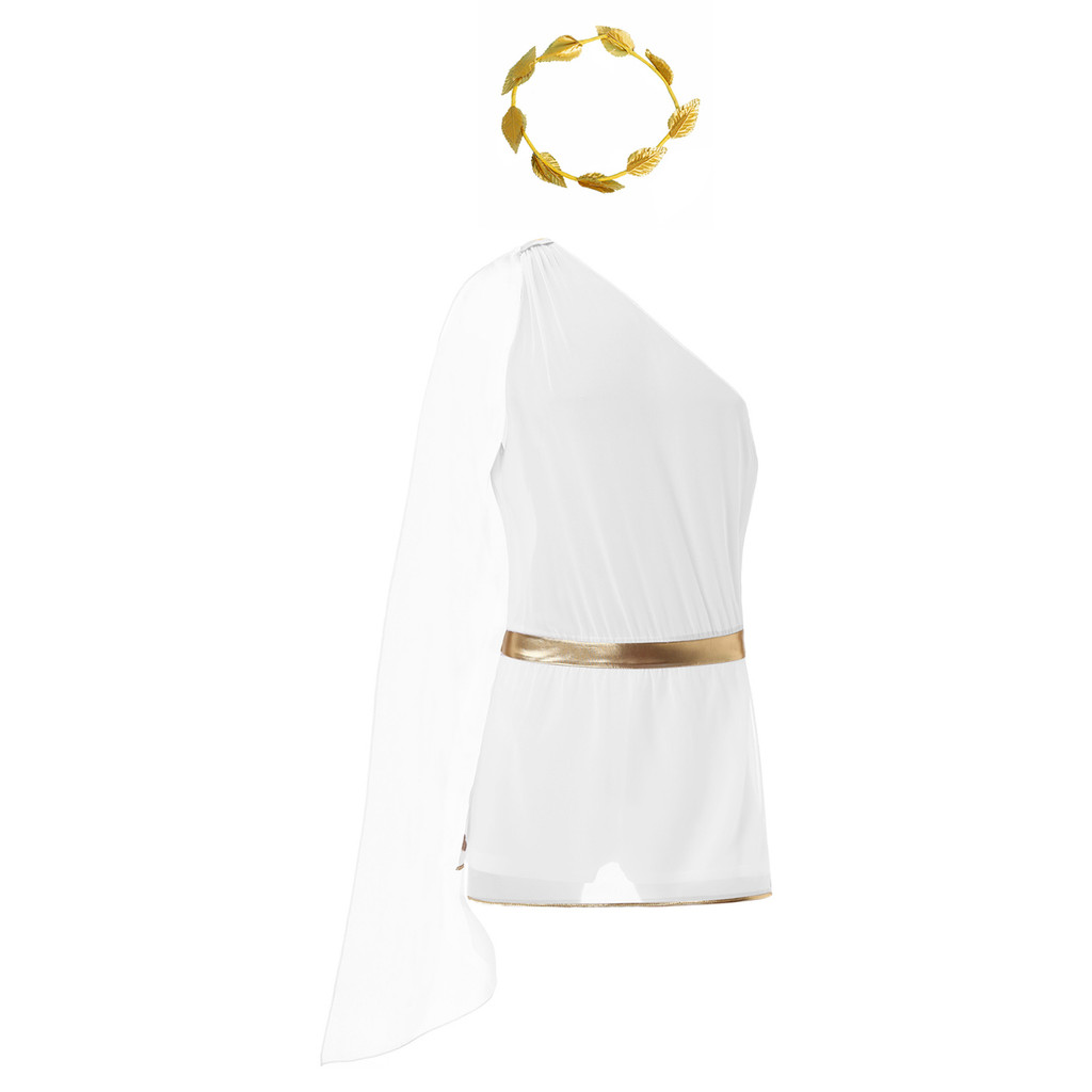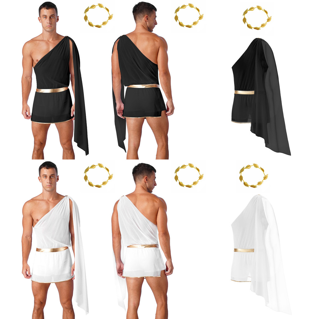 Men Halloween Carnival Ancient Greek Roman God Prince King Mr. Toga Cosplay Costume One Shoulder Leotard Bodysuit with Gold Leaf Headwear Church Choir Gown