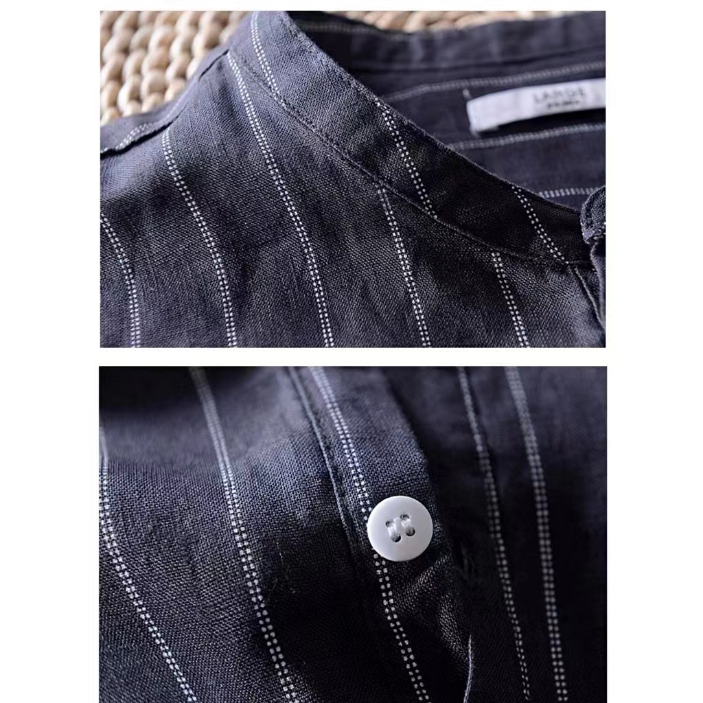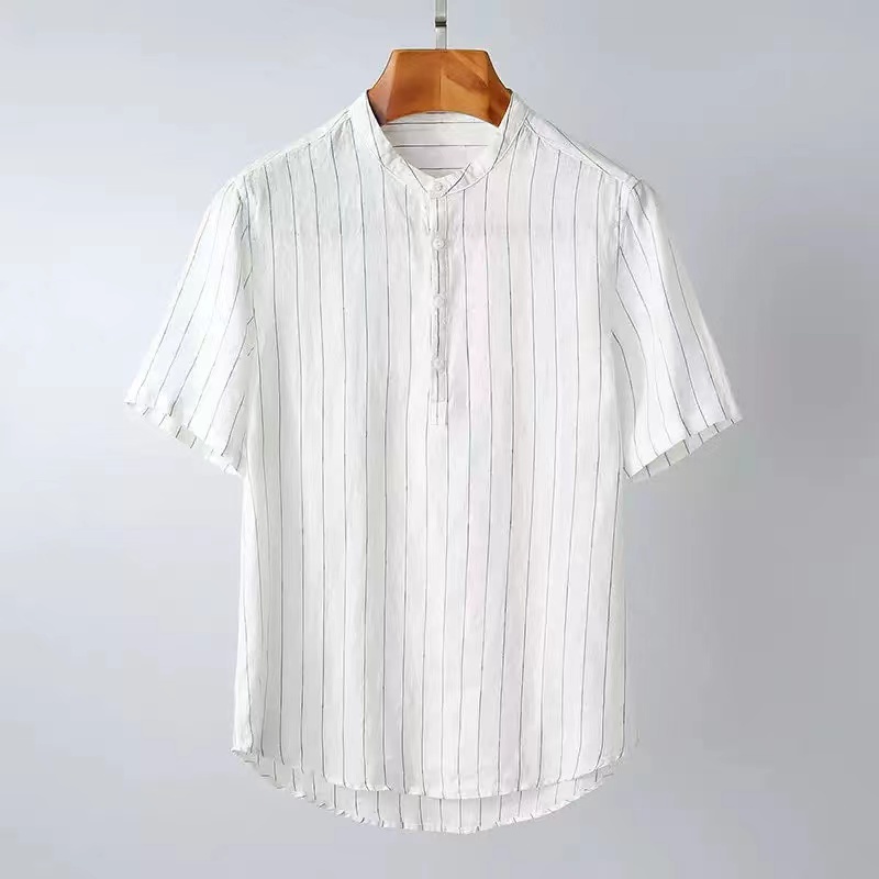 Mens Chinese Collar Polo Striped Cotton Linen Mandarin Colla Short Sleeve Casual Polo Shirt