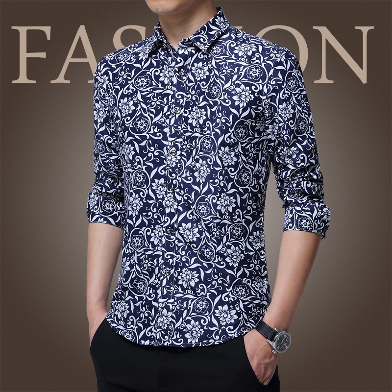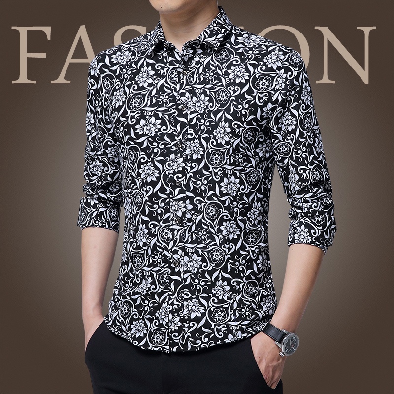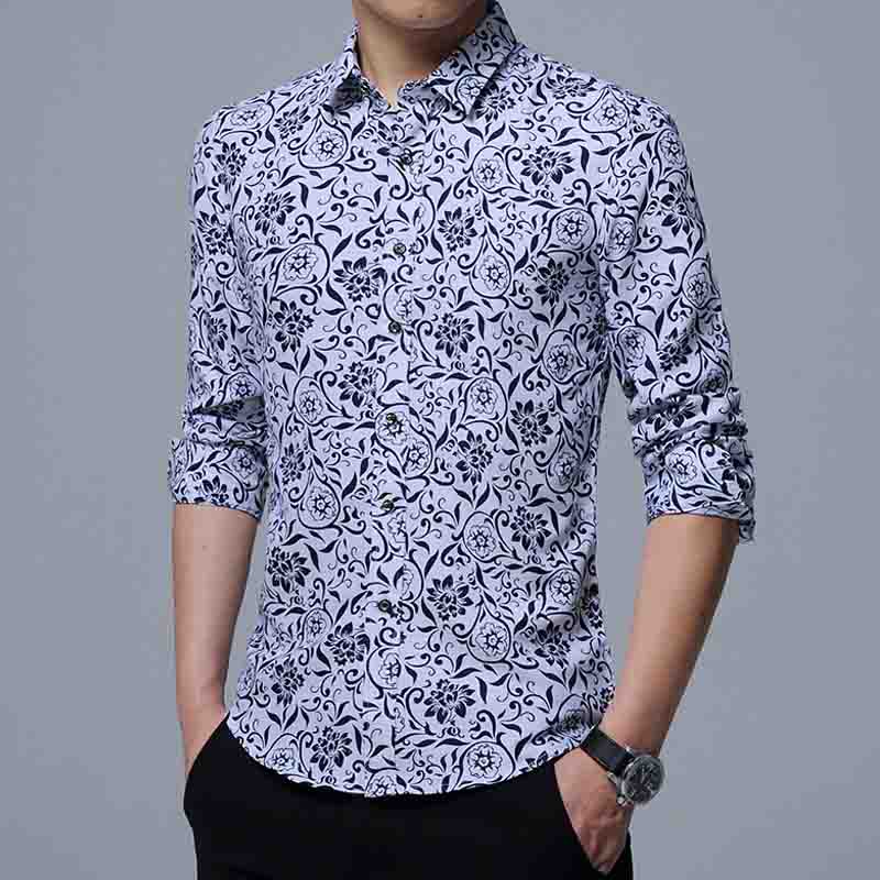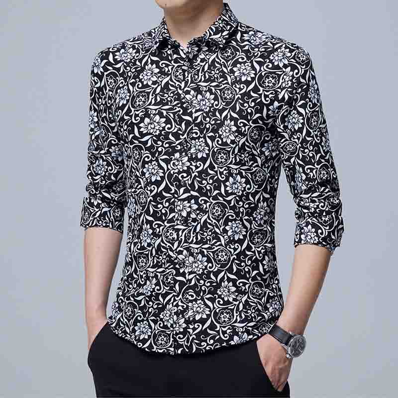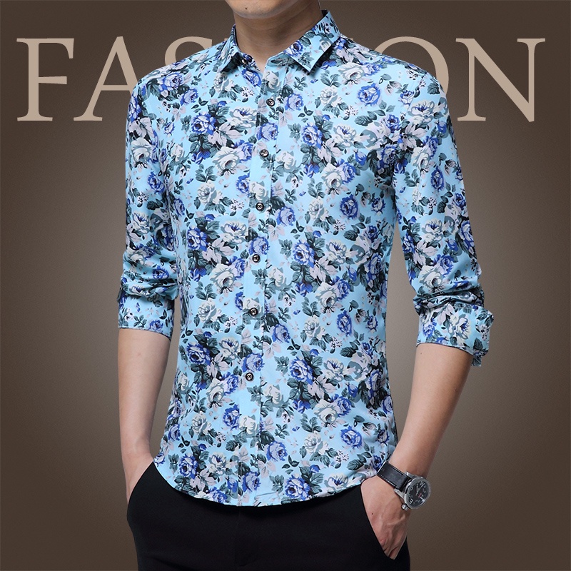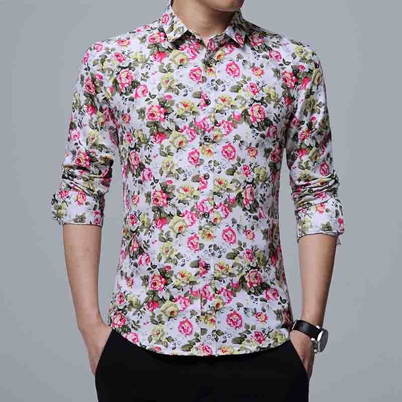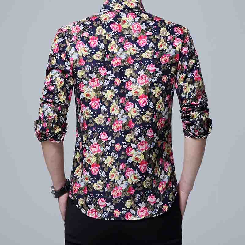 Mens Slim Fit Sleeve Trend Casual Flower Shirt Men Retro Design Casual Roses Flowers Print Long Sleeves Shirts