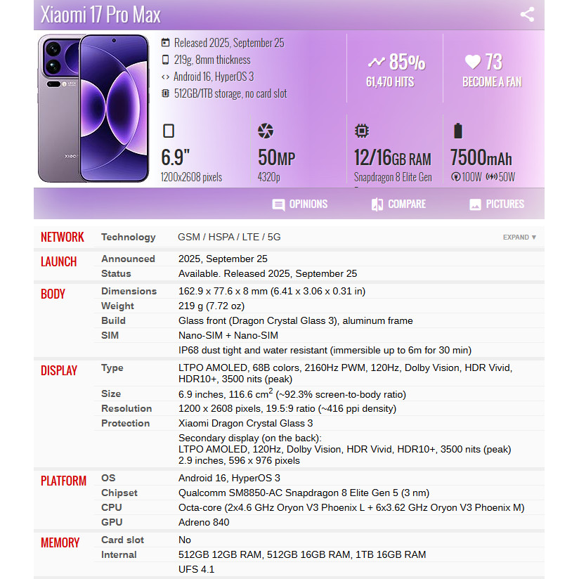 Xiaomi 17 Pro Max Leica Light and Shadow Master Mobile Imaging System|Leica 5X Super Concentrating Periscope Telephoto|Miaoxiang Back Screen