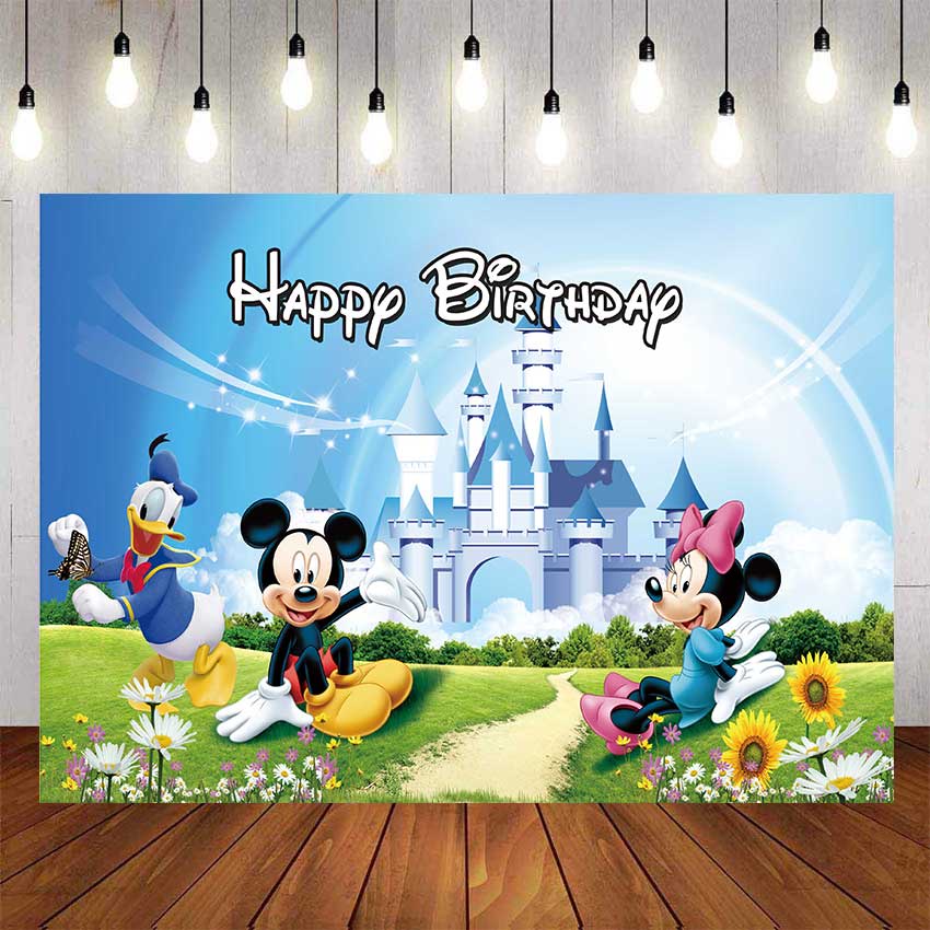 Mickey Minine Mouse Birthday Backdrop For Photography Baby Kids Blue Castle Background Customed Name Photo