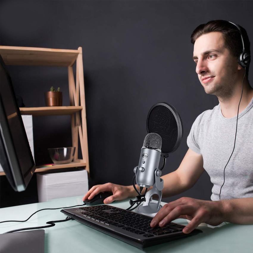 Microphone Pop Filter Dual Layer Mic Pop Shield with Clip Stabilizing Arm for Recording (Black)