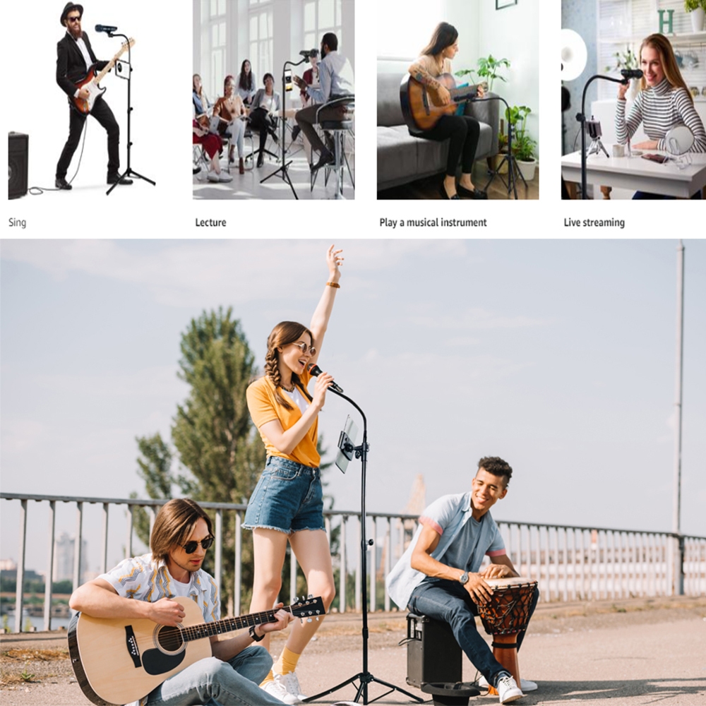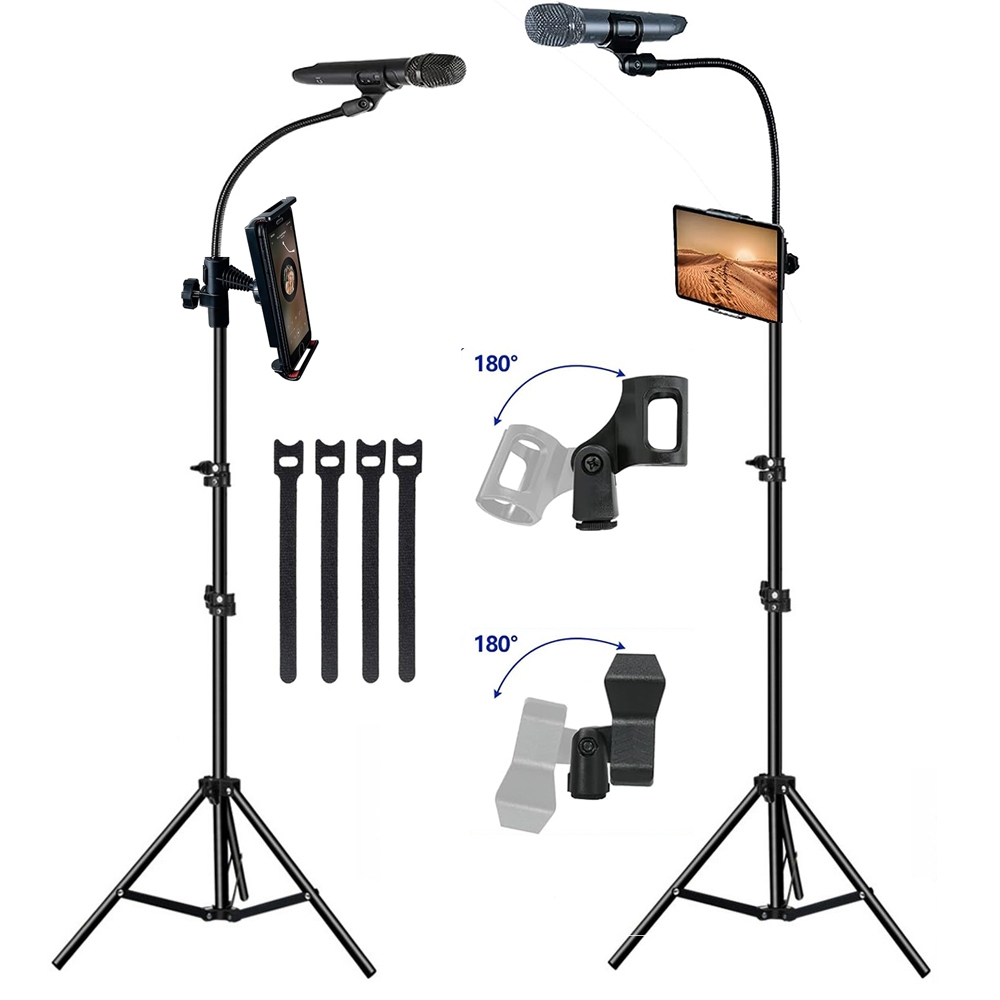 Microphone Stand Portable Mic Stand with Phone Holder,Detachable Gooseneck Mic Tripod - Adjusted Height Feet - with 2 Standard Mic Clips