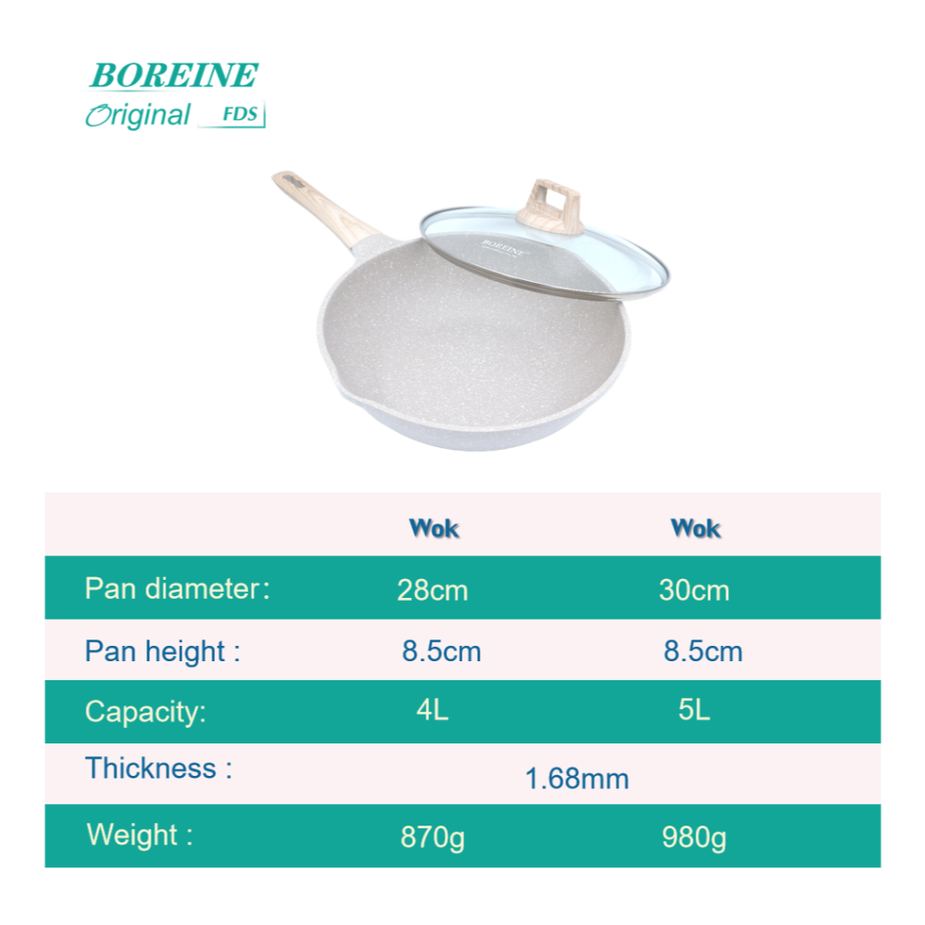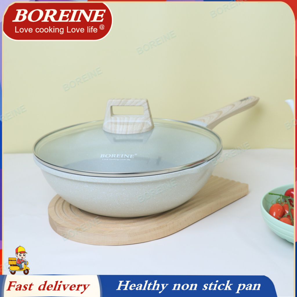 Boreine Non Stick Frying Pan 28/30cm Wok With Lid Non-PFOA Suitable For All Stoves Low Oil